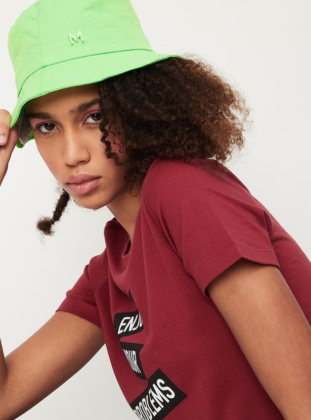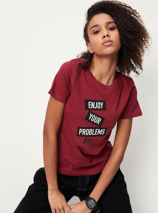 Let your style speak for yourself with this t-shirt. It comes with a slogan-printed surface, half sleeves, and a round neckline. Team it up with a pair of trousers and lace-up shoes to complete the look.