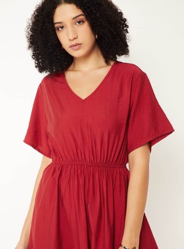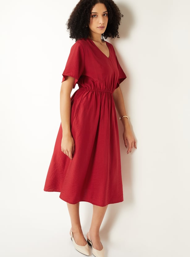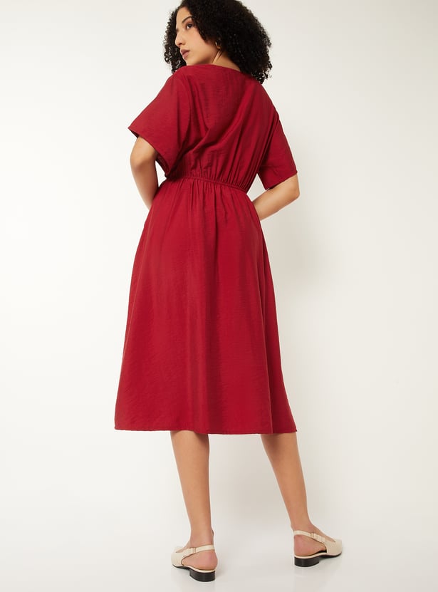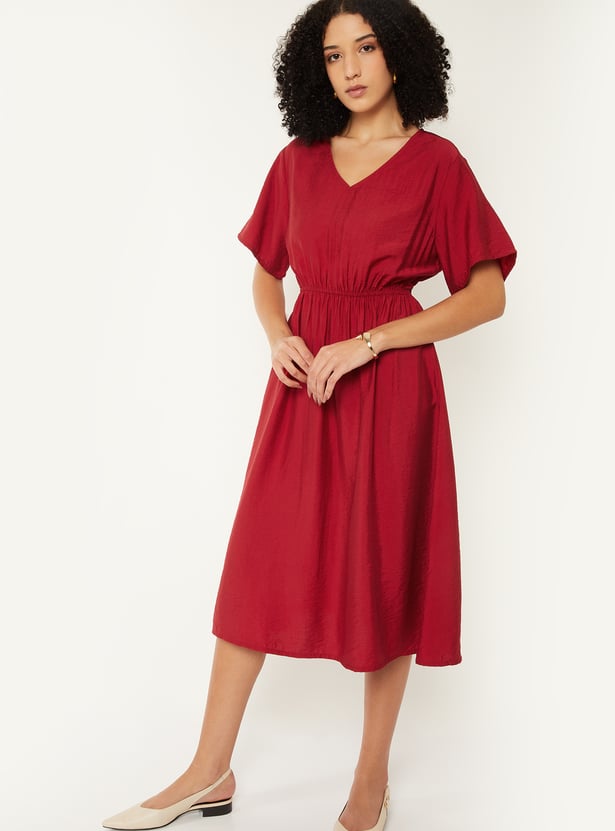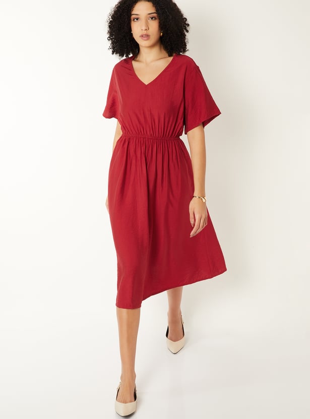Step out in effortless elegance with this solid A‑line dress, featuring a flattering V‑neckline, half sleeves, and an elasticated waist for a comfortable yet defined fit. The timeless silhouette makes it perfect for both casual outings and semi‑formal occasions.