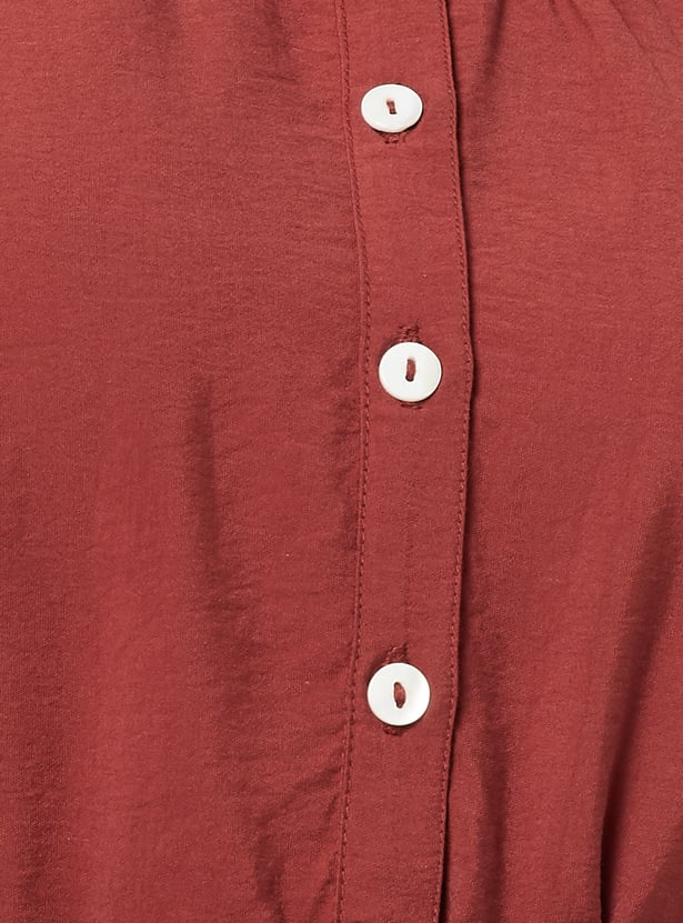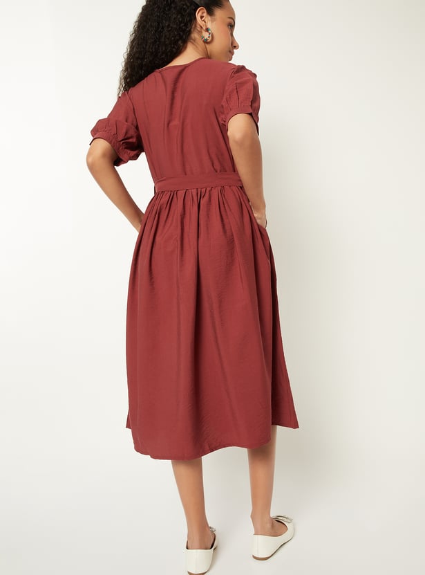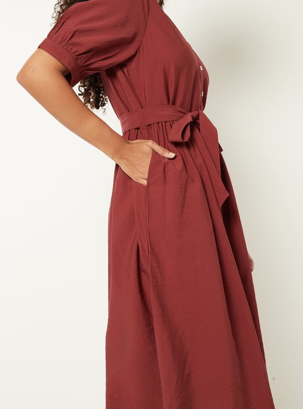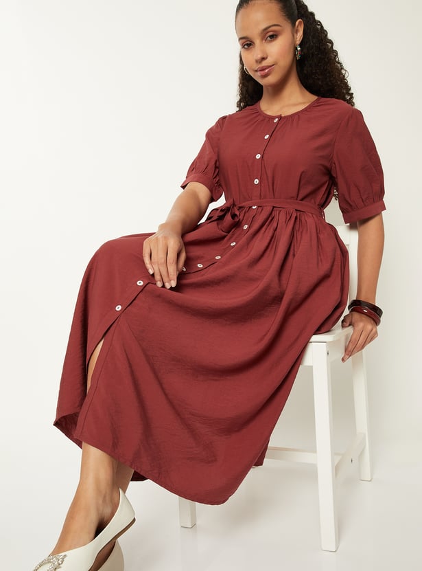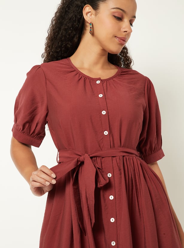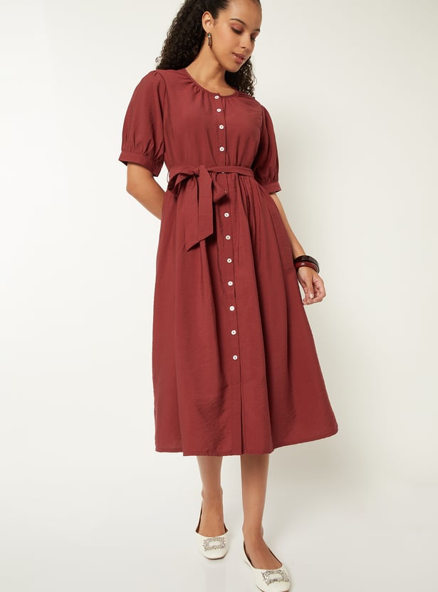 Classic charm with modern ease, this solid a-line dress features a round neck, half sleeves, a button placket, and handy pockets. The tie-up detail at the waist adds definition, while the flowing fit & flared silhouette ensures comfort and style for any occasion.