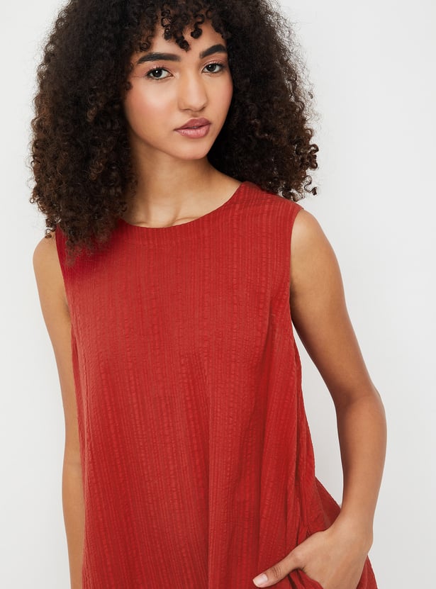 Step out in effortless elegance with this textured A-line dress, designed with a classic round neck, sleeveless silhouette, and a flattering knee length. The textured fabric adds a subtle yet sophisticated touch to this timeless style.