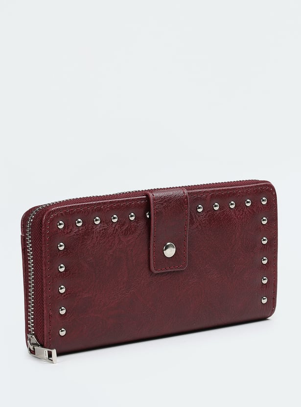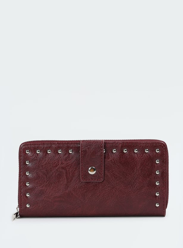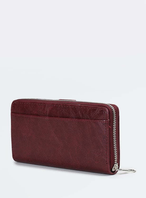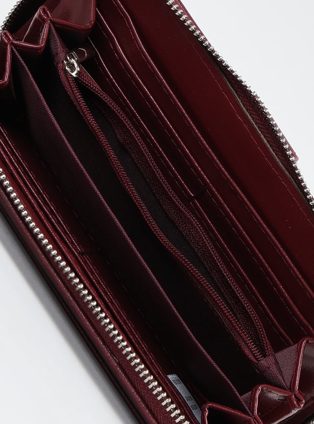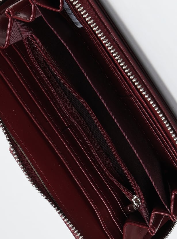 This textured clutch features a zip-around design with a push-button closure for added security. The multiple compartments help keep your essentials organized, making it both stylish and practical for any occasion.