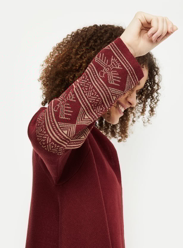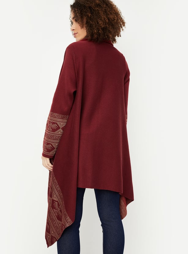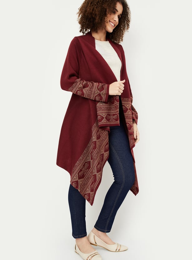 Embrace the season in style with this chic shrug! Featuring woven full sleeves, a front open design, and an asymmetric hem, it effortlessly elevates any outfit while adding a touch of sophistication.