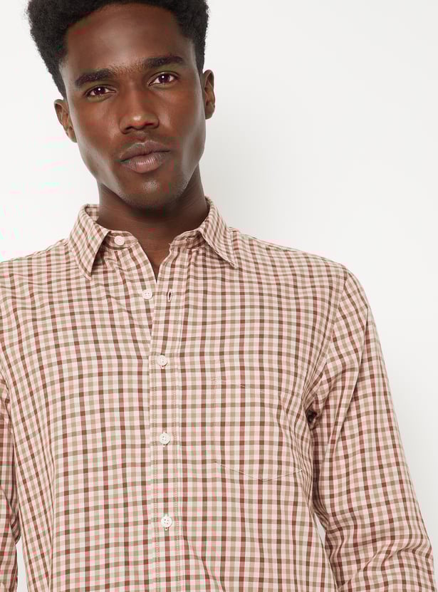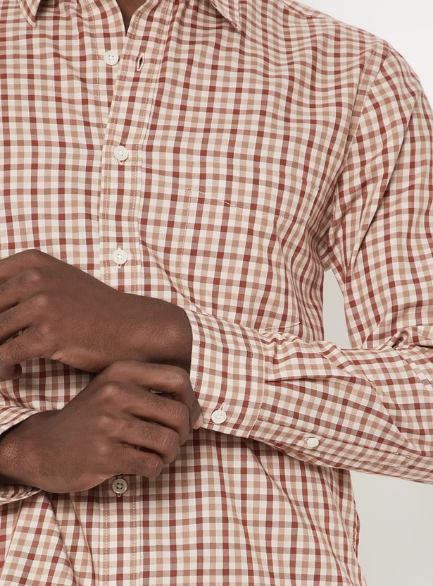 This checked regular-fit shirt features full sleeves and a classic spread collar, crafted in a timeless checked pattern for versatile styling. Perfect for both office wear and casual outings.