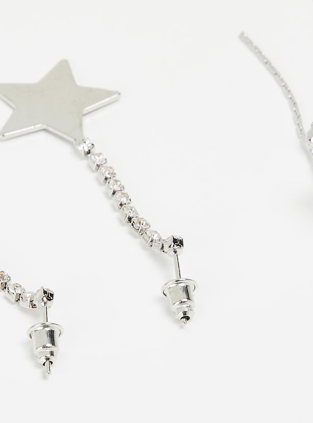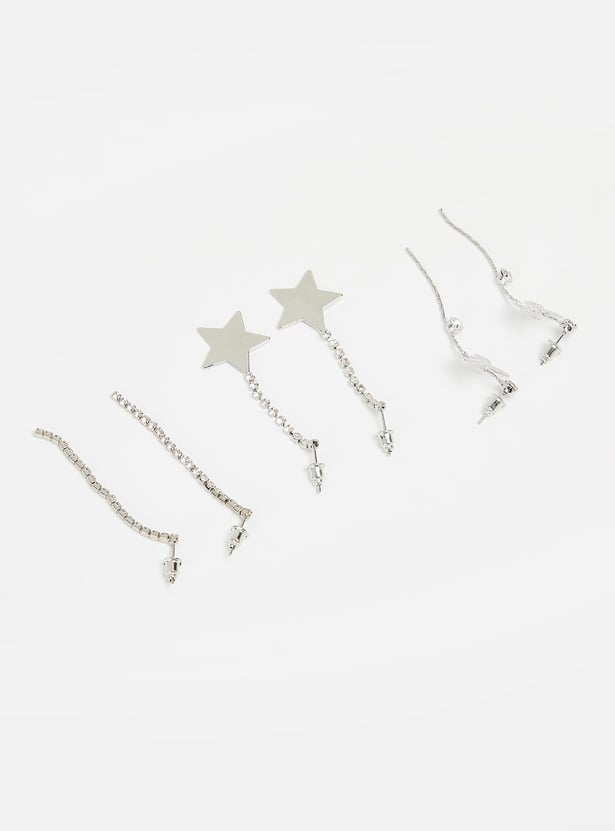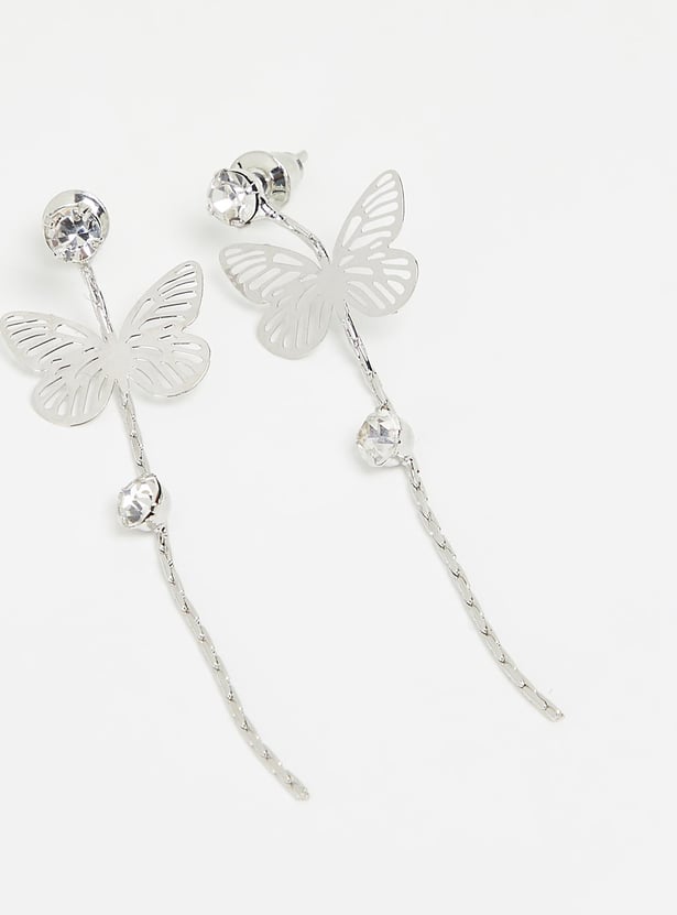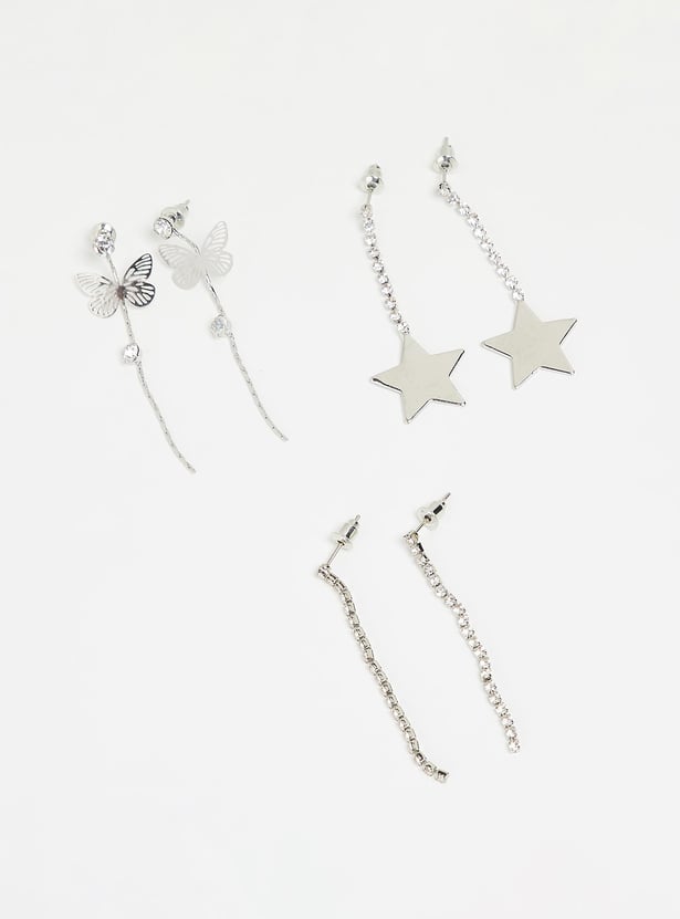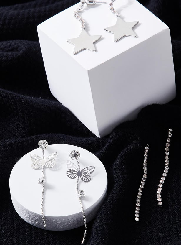 Add a hint of sparkle to your outfit with this pair of danglers. It has a pair with star drops, a pair with butterfly accents, and a pair with stone embellishments. These earrings are secured with a post and back closure.