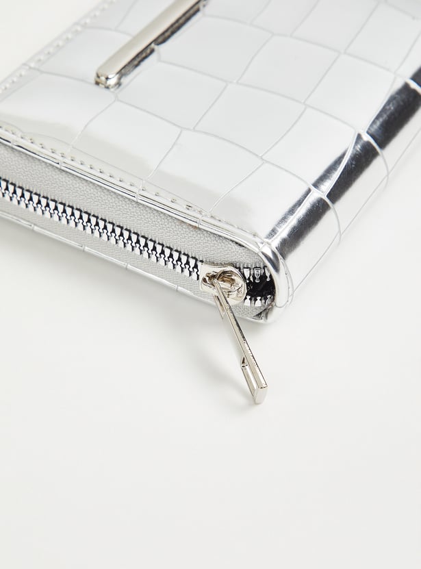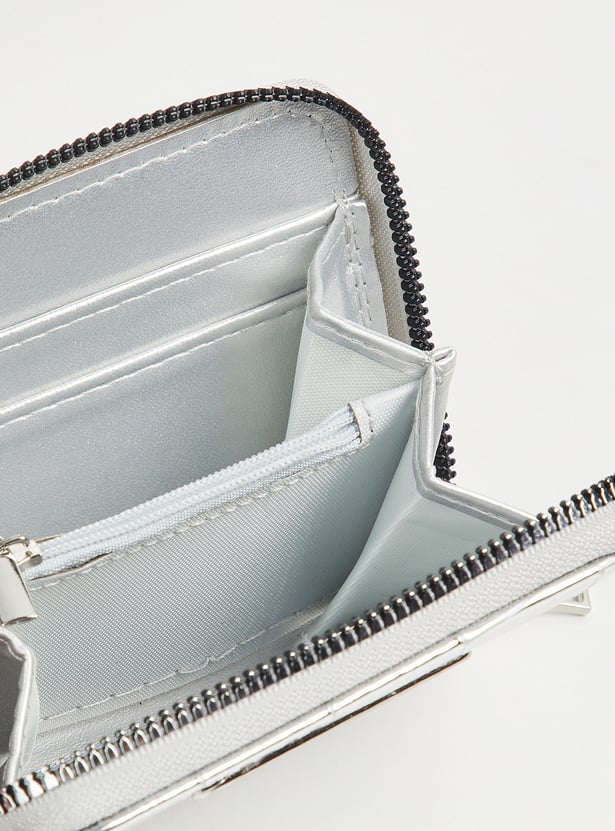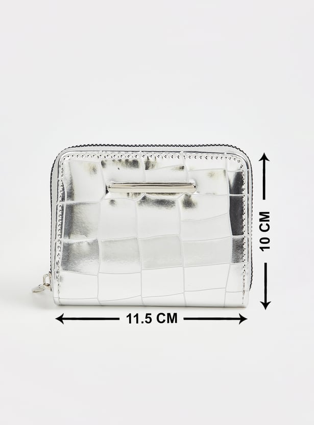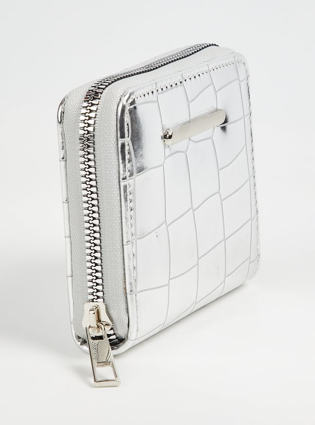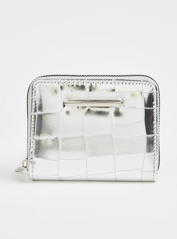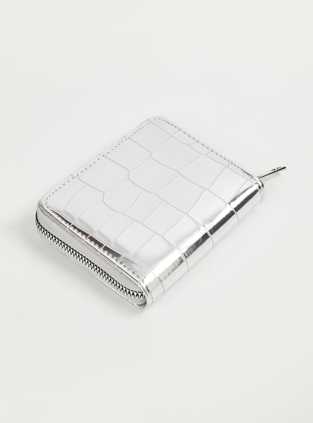 This stylish and compact wallet is designed for everyday use. Features a metallic embossed pattern with 2 compartments and card slots for cash and cards, ensuring organised storage. The secure zip closure adds convenience and safety, making it a practical everyday accessory.