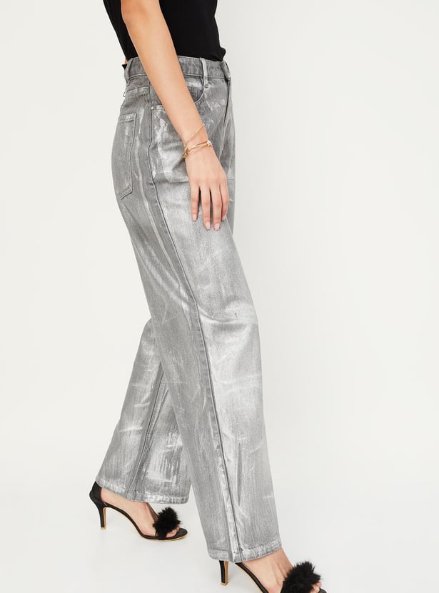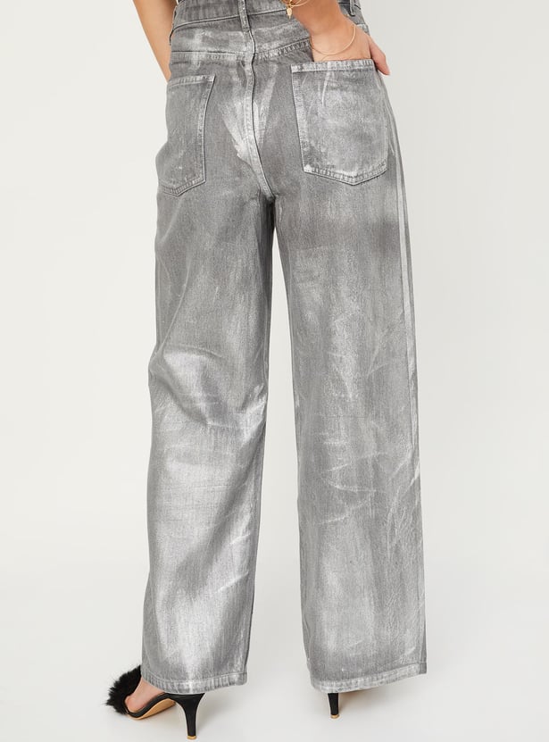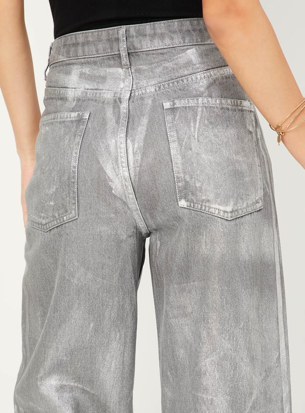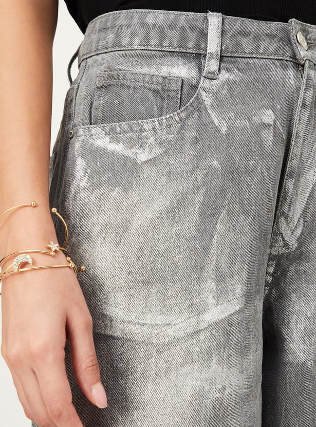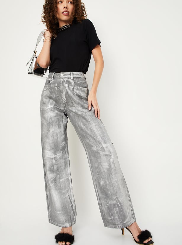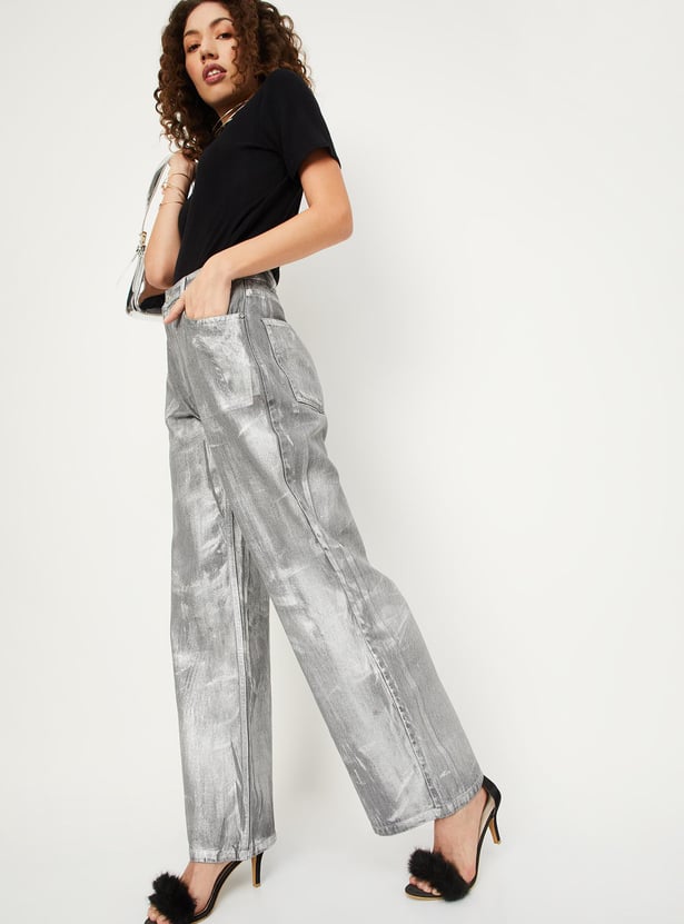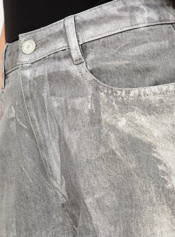 Flaunt your style in this pair of jeans. It is highlighted with metallic print which lends a signature look. This pair has a mid-rise waist with belt loops, 5 pockets for a classic look, and a skater fit profile.