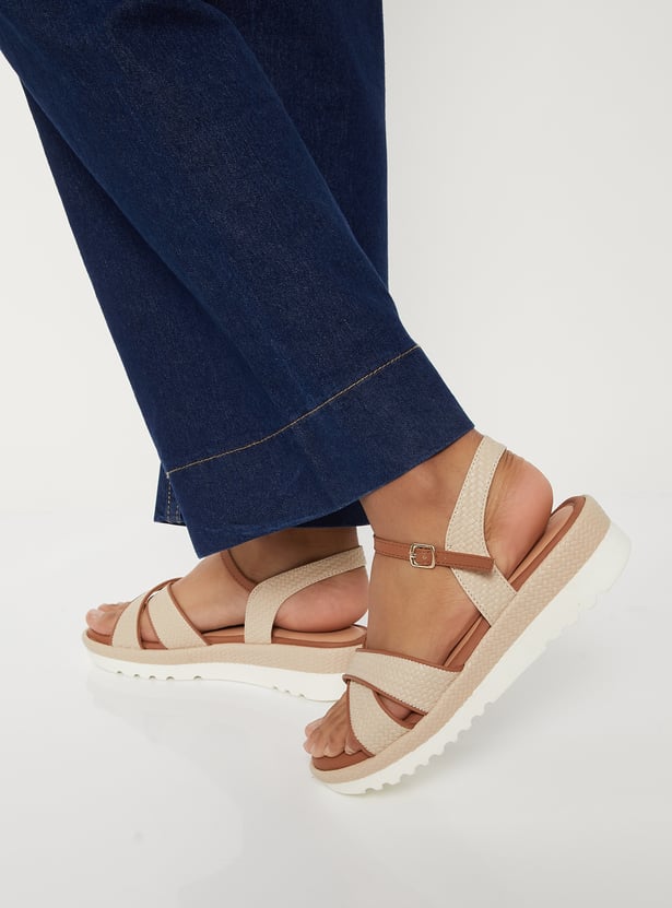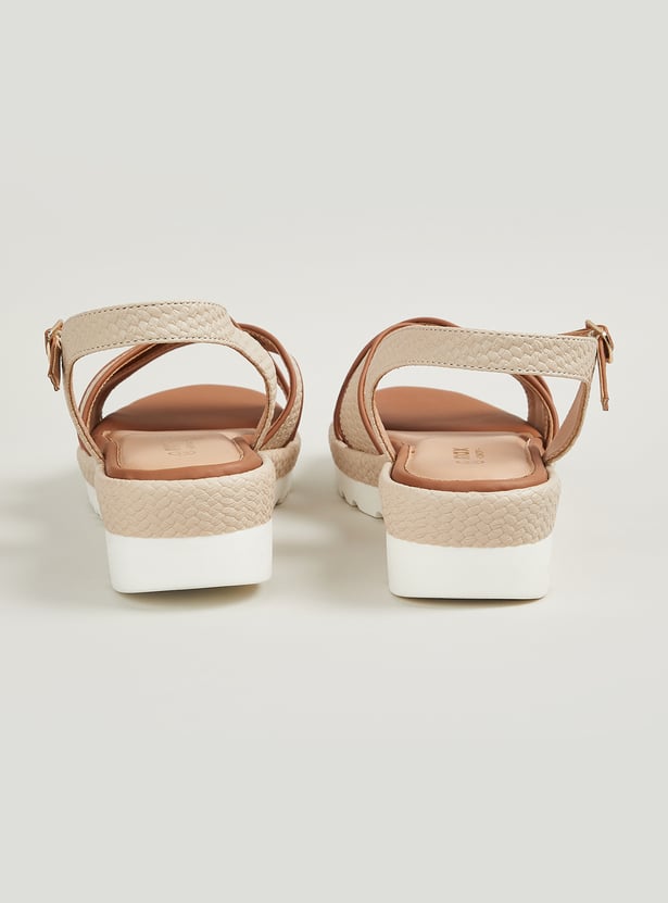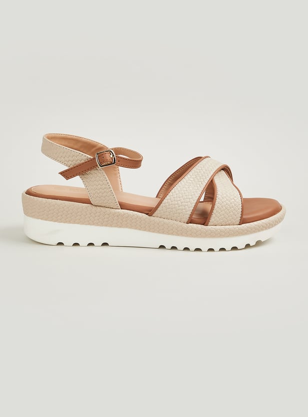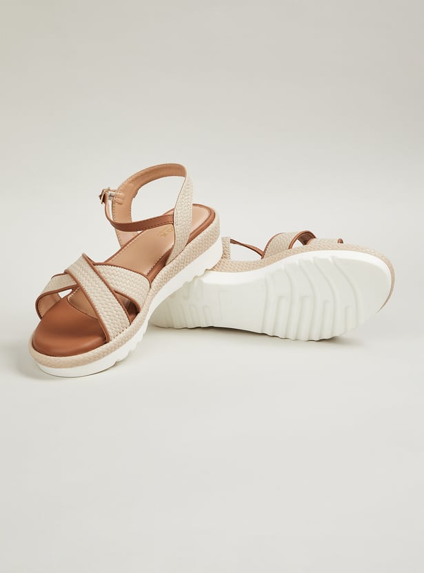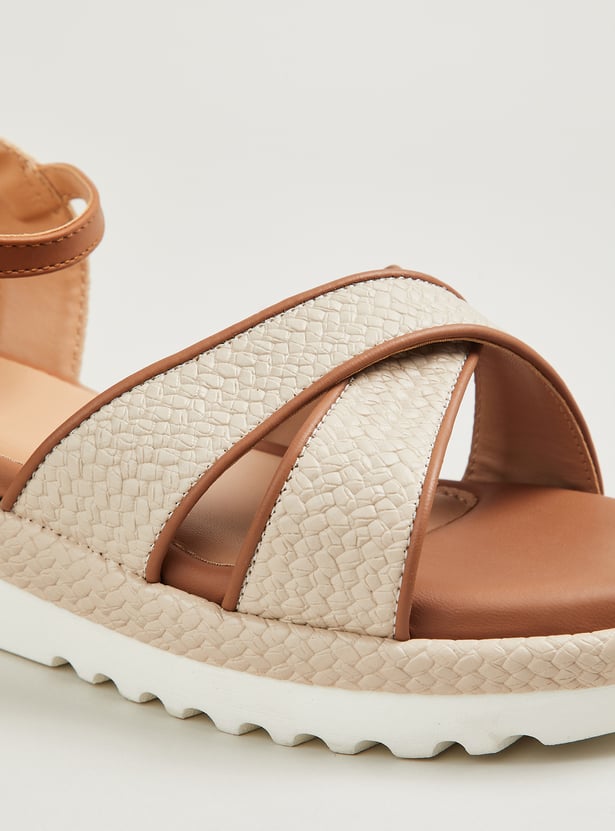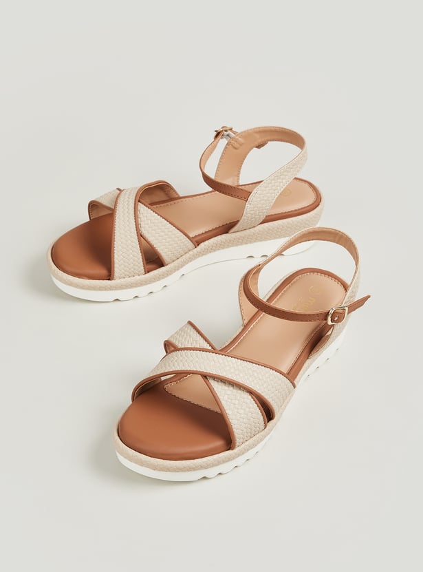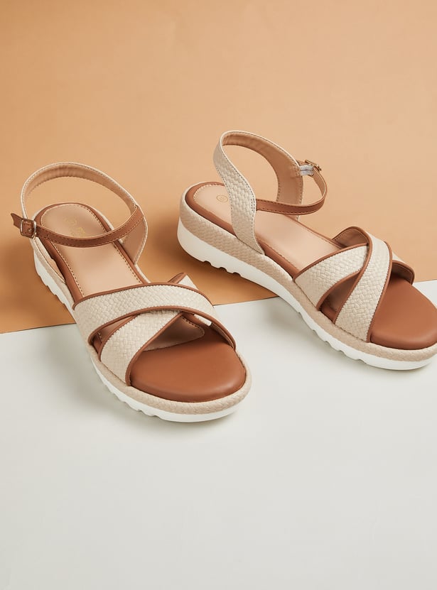 Add height with comfort in these cross strap wedge sandals. Designed with an open-toe profile, they feature textured cross straps at the front with contrast piping for a stylish touch. An ankle strap with buckle ensures a secure fit, while the wedge heel and durable outsole provide stability for all-day wear.