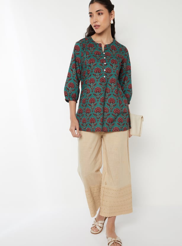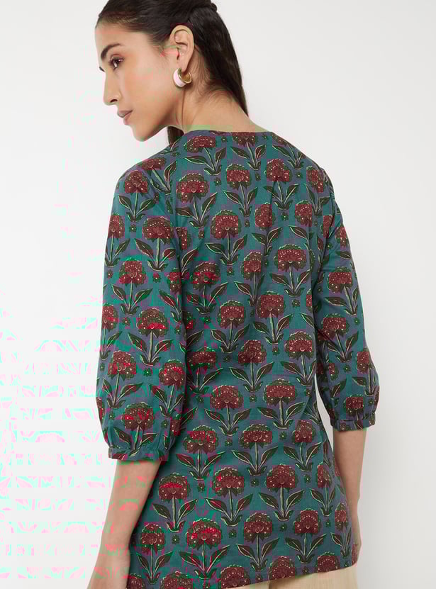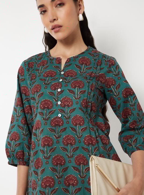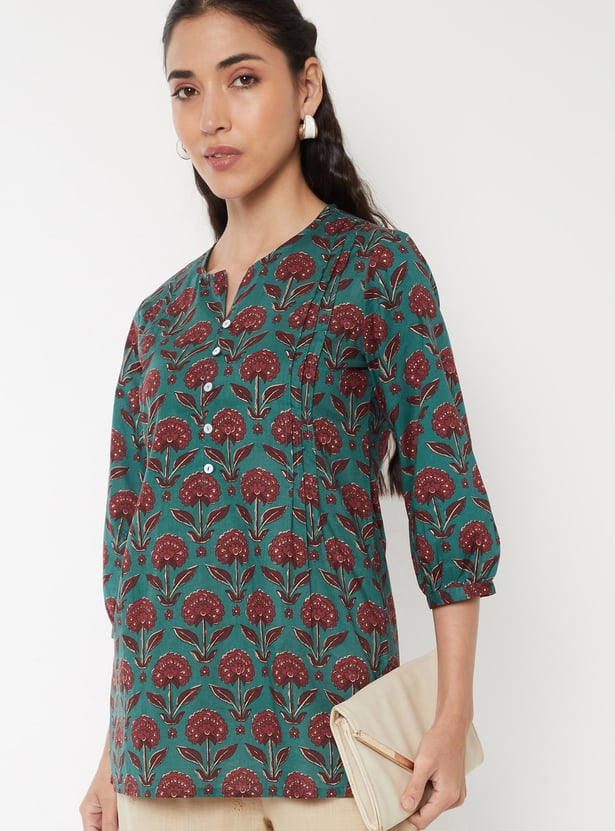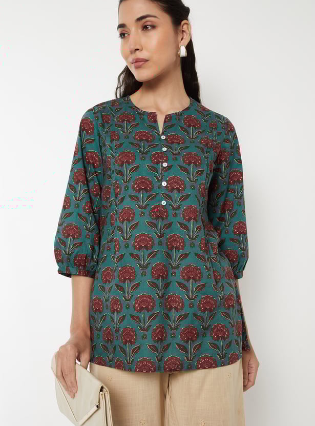 Refresh your everyday style with this floral print short kurti. Designed with a notched neck, 3/4th sleeves, and side slits, it offers both comfort and a flattering silhouette.