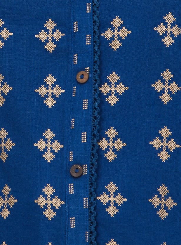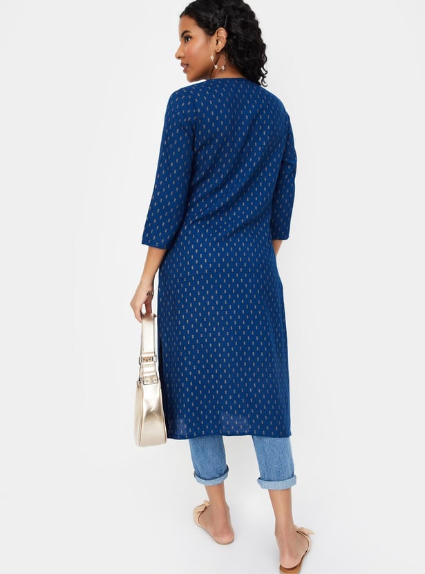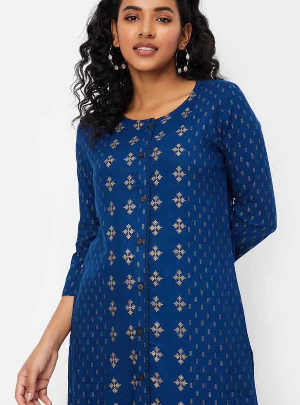 Flaunt a look of elegance in this foil-printed straight kurta. It features a round neck, three-quarter sleeves, lace, and buttons at the front.