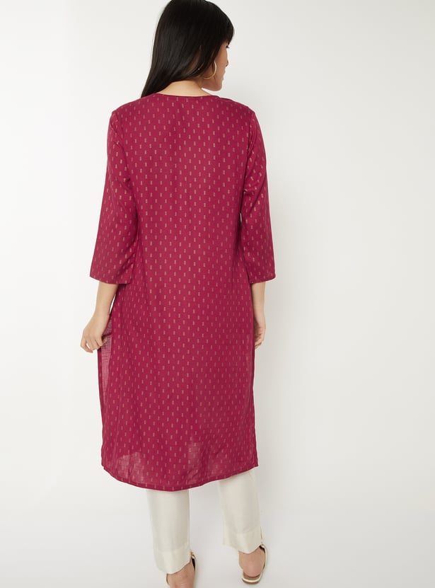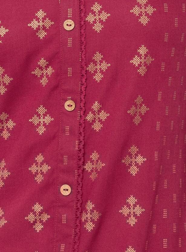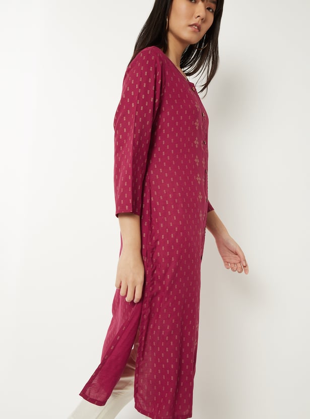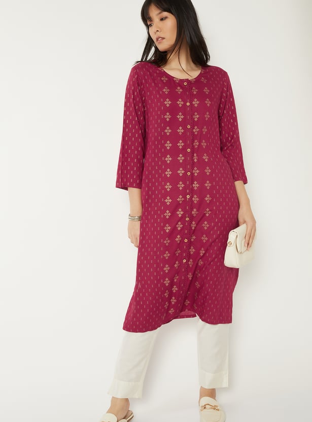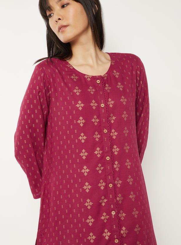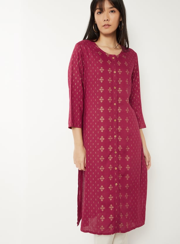 Flaunt a look of elegance in this foil-printed straight kurta. It features a round neck, three-quarter sleeves, lace, and buttons at the front.