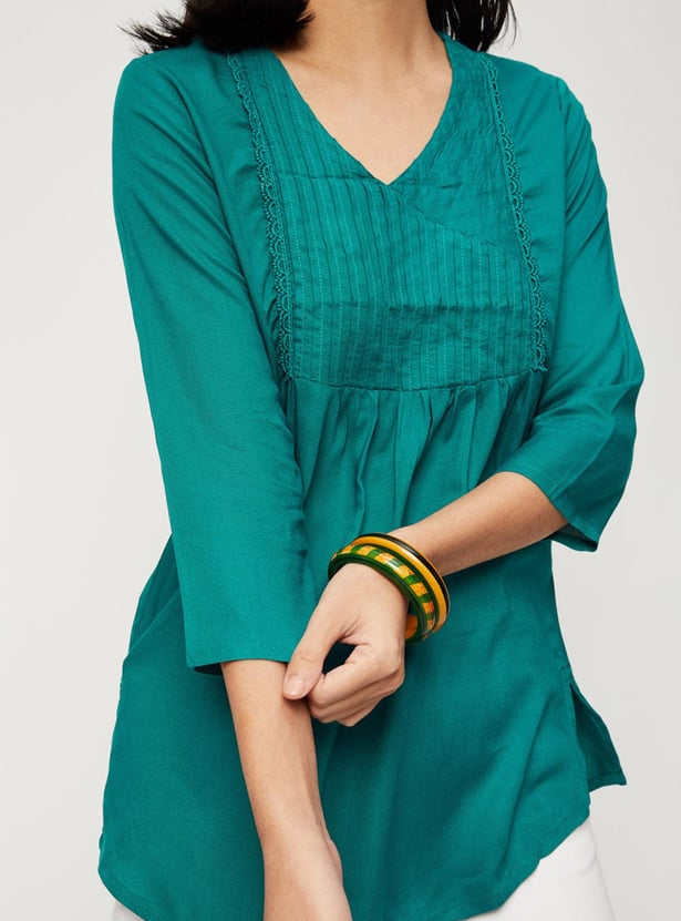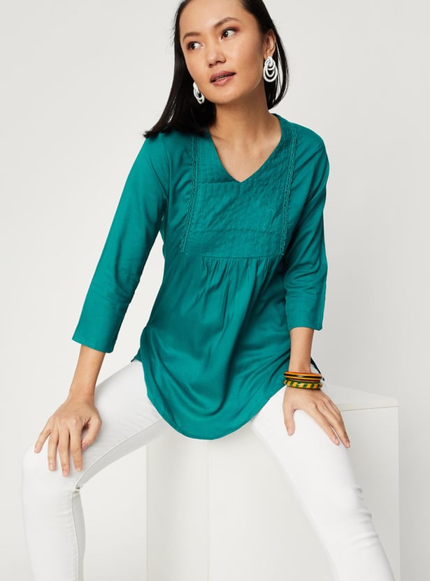 A wardrobe must-have, this kurti is tailored in an A-line profile. It features a pintuck yoke with lace trim, a V-neck, three-quarter sleeves, side slits, and a curved hem.