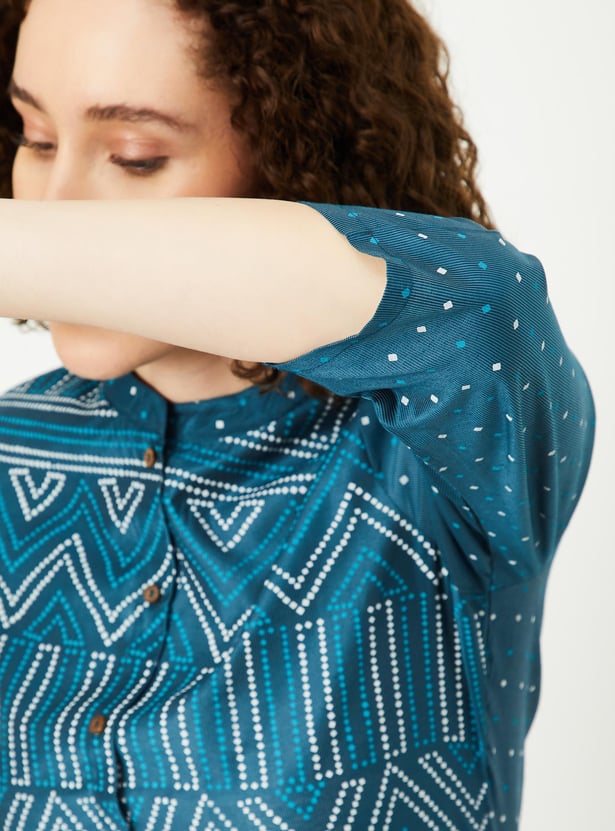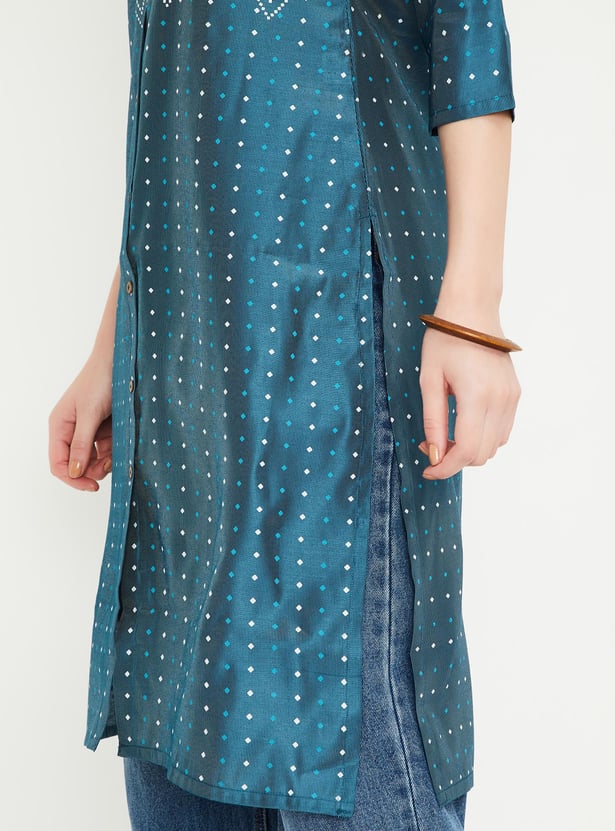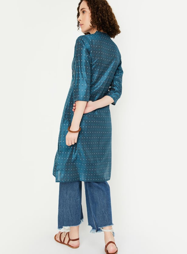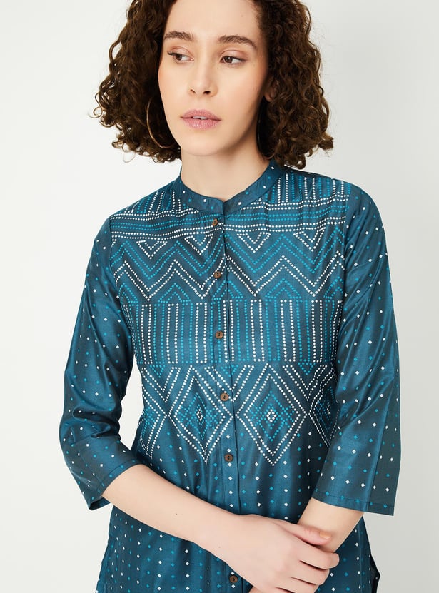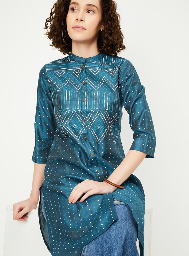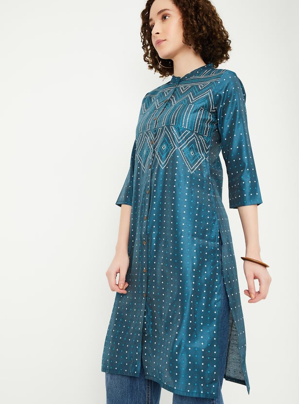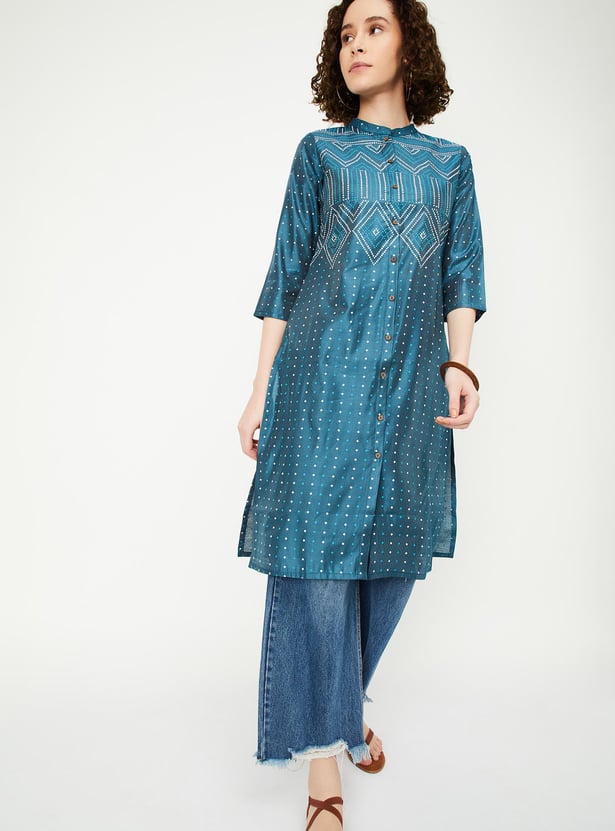 Slip into effortless elegance with this printed kurta. Boasting a chic band collar, button placket, three-quarter sleeves, and a sleek straight hemline, it's the epitome of understated style.