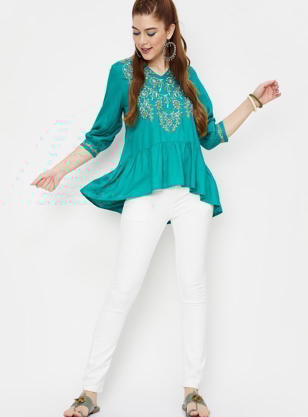 Paint a picture of elegance in this tunic. It features an embroidered yoke, V-neck, three-quarter sleeves, and a tiered hem. Style this tunic with jeans and block heels for a fusion look.