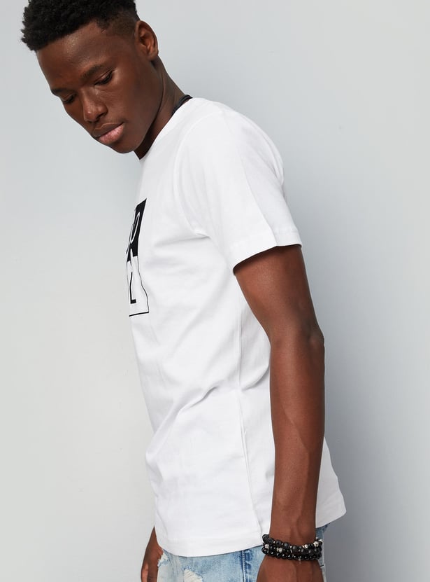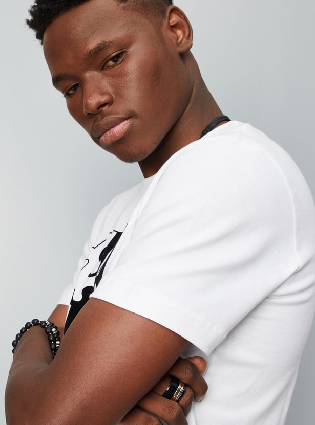 Ace your casual style with this T-shirt that is crafted in a slim-fit profile. It is designed with a crew neck, short sleeves, and a graphic print at the chest. Style this tee with denim shorts and sneakers to complete the look.