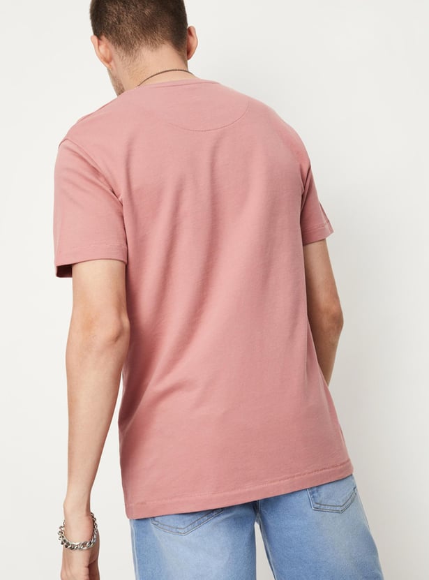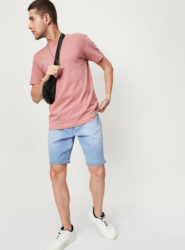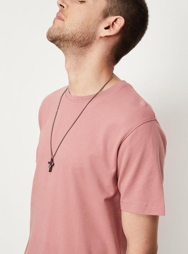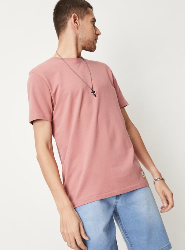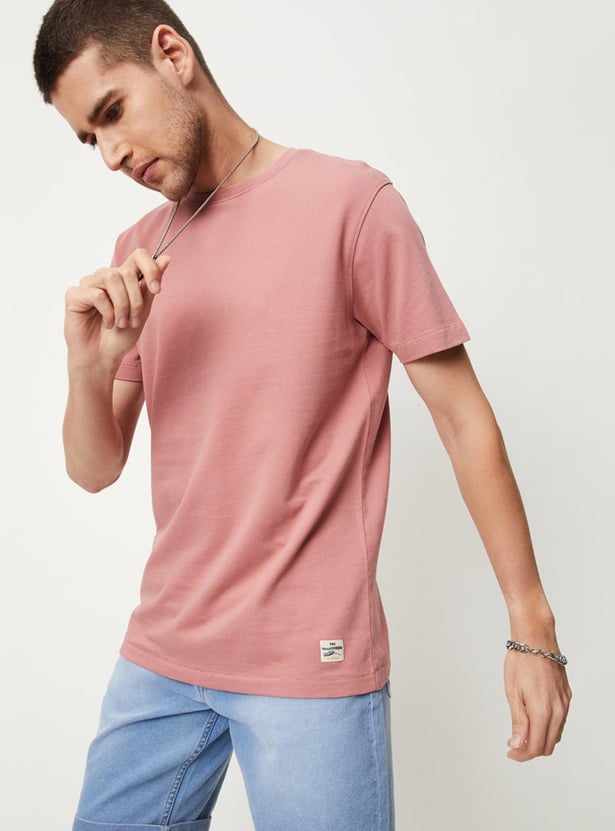 Build your basic wardrobe with this T-shirt that is rendered in a solid tone. It features a crew neck, short sleeves, and a slim-fit profile. Style this tee with denim shorts and sneakers for an off-duty look.