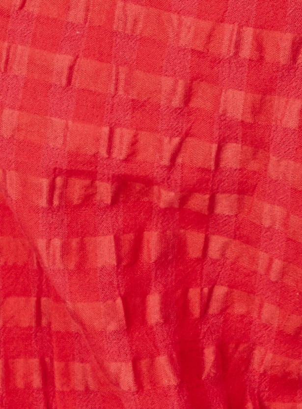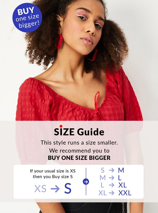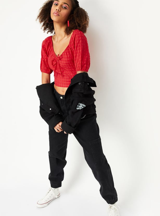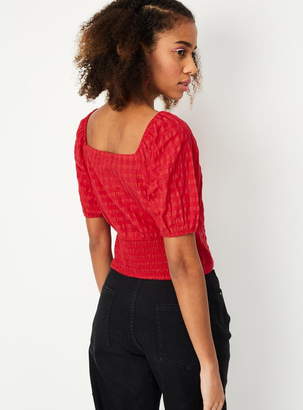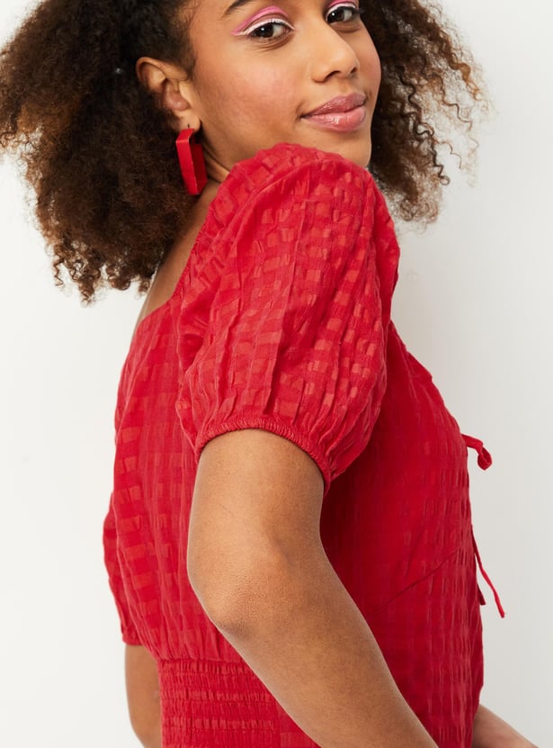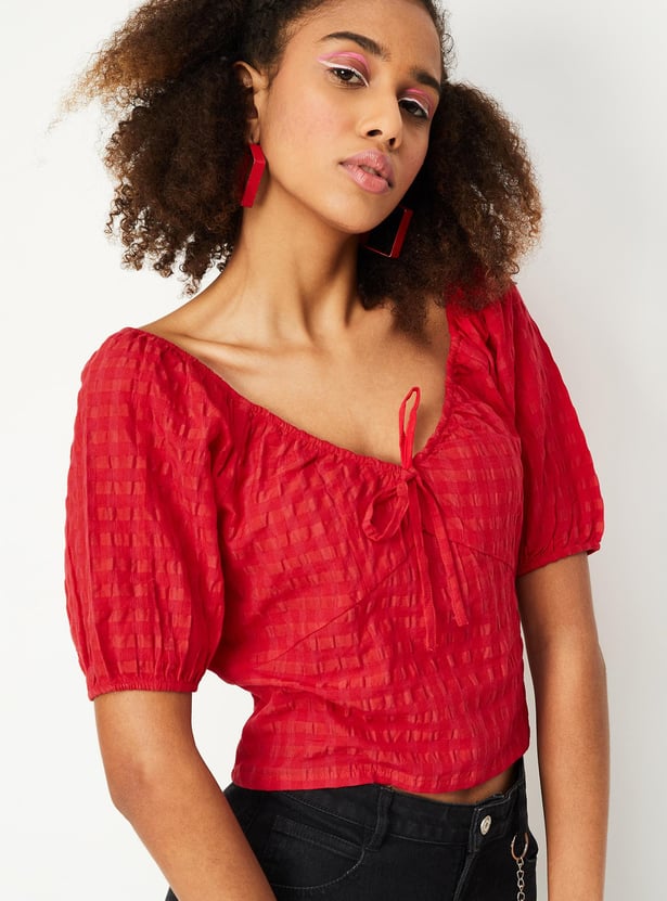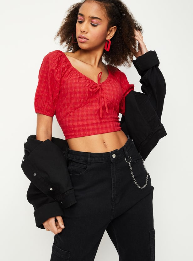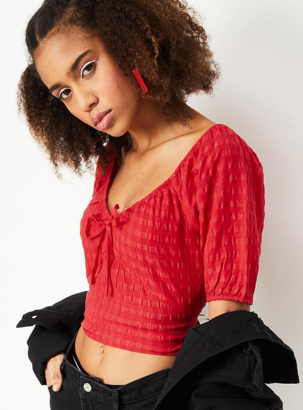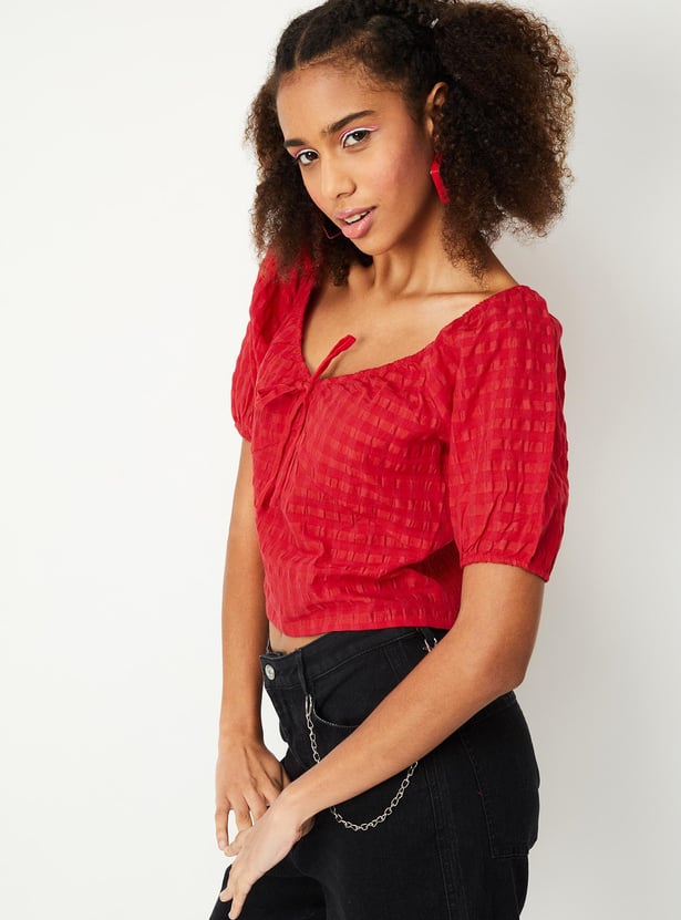 Look casual chic in this cropped top with a checked pattern and a textured surface. It features a tie-up neck, raglan sleeves, a square back neck, and a smocked back hem. Look your stylish best by styling this top with a pair of jeans and sneakers.