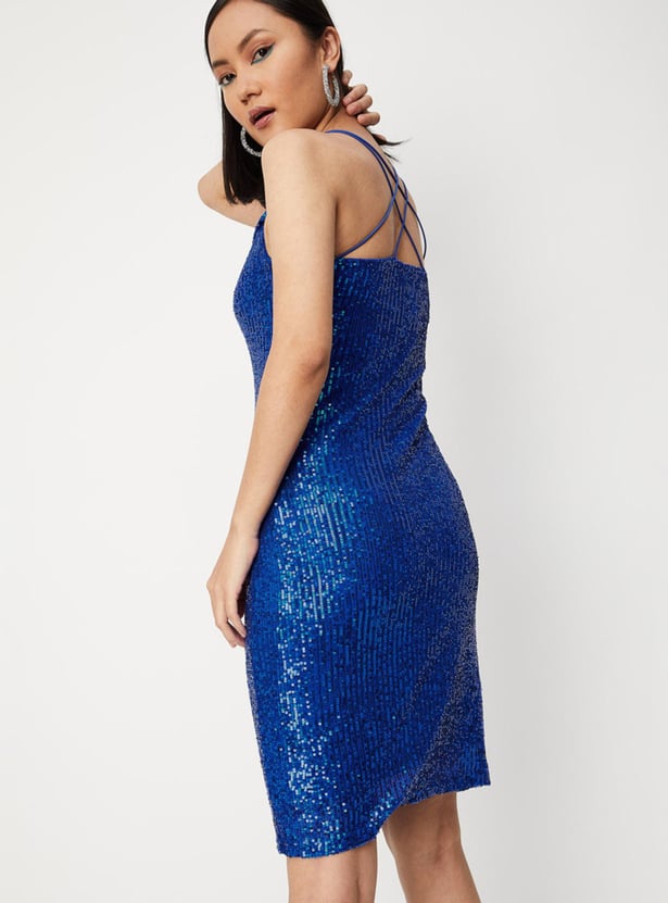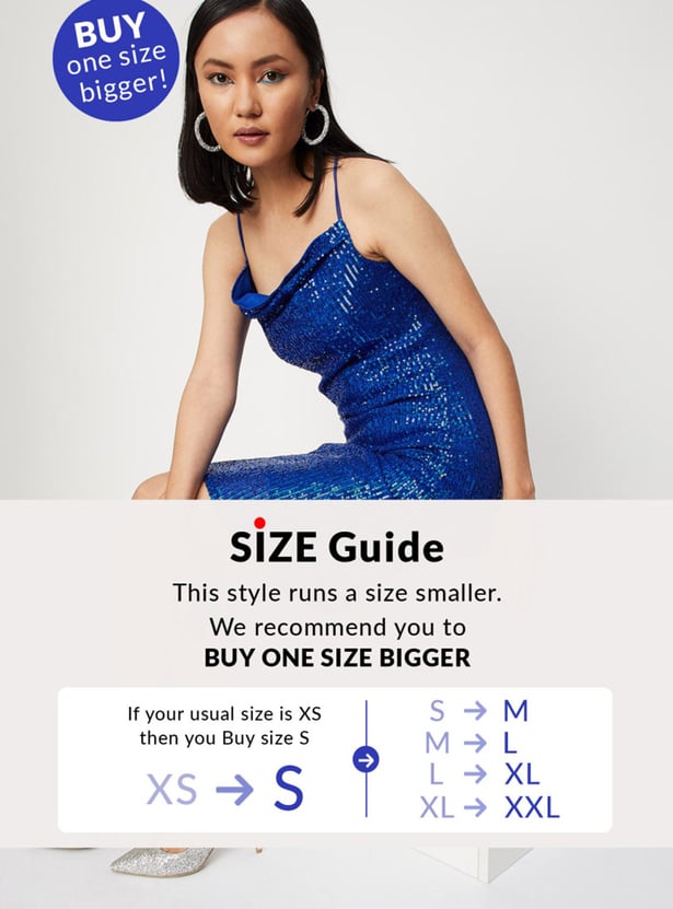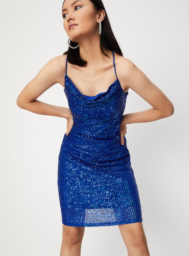 Channel your inner disco styling with this bodycon dress. It is fashioned with spaghetti straps, a cowl neck, sequinned detailing, and a mini-length profile. Complete the party-ready look with a pair of shimmery stilettos and a matching clutch.