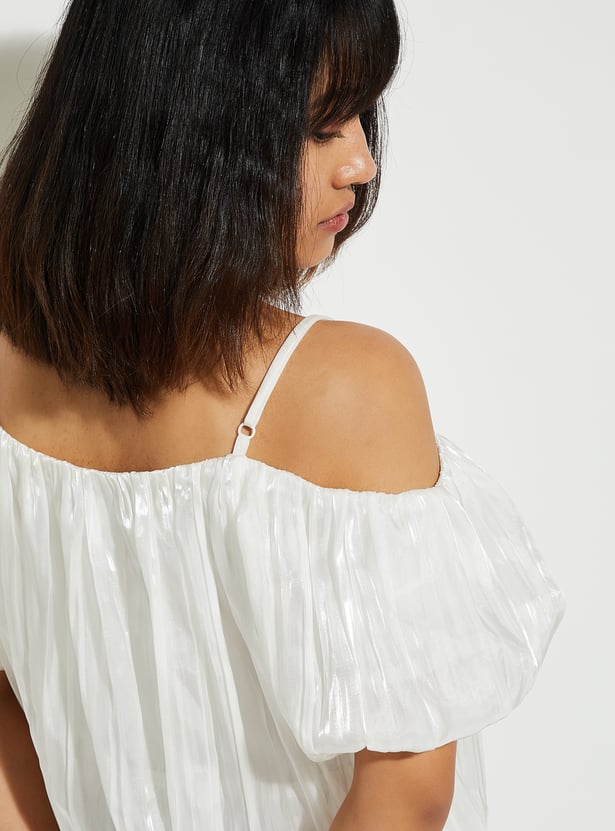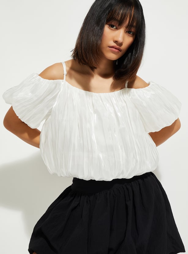 This cold shoulder top features a gathered body and puffed sleeves, creating a relaxed, airy silhouette. The adjustable spaghetti straps ensure a perfect fit without compromising comfort. It's a piece that blends modern trends with easy wearability.
