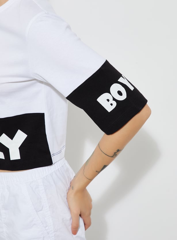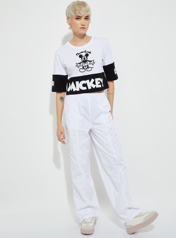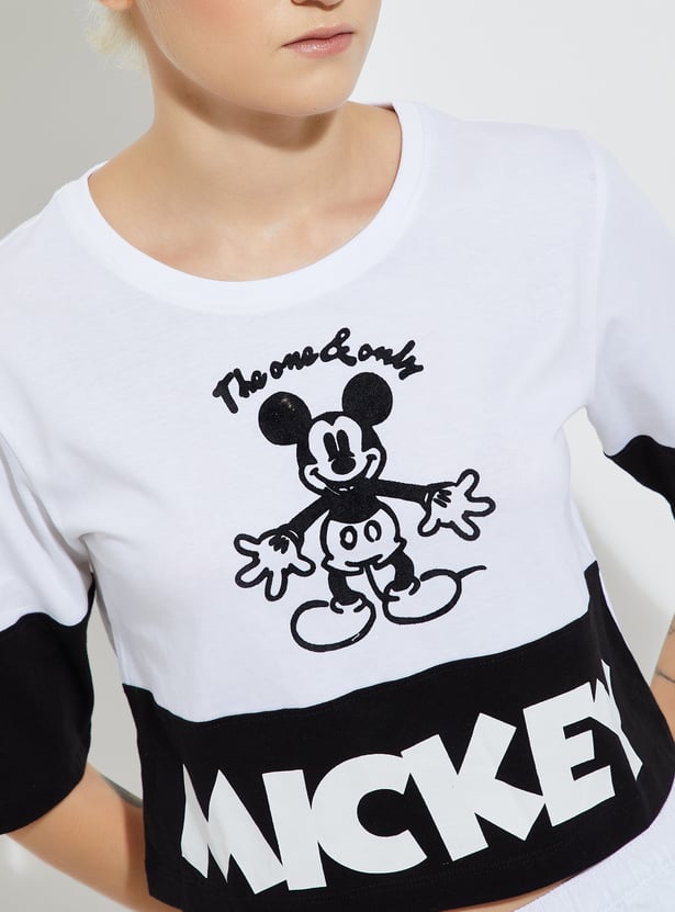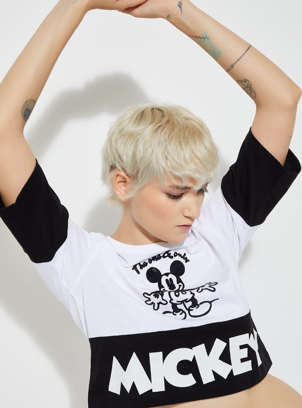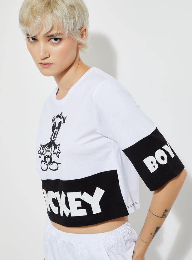 Add a playful touch to your style with this boxy fit Mickey Mouse print crop T-shirt, featuring a round neck and half sleeves. Fun, comfy, and perfect for casual days.