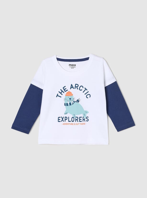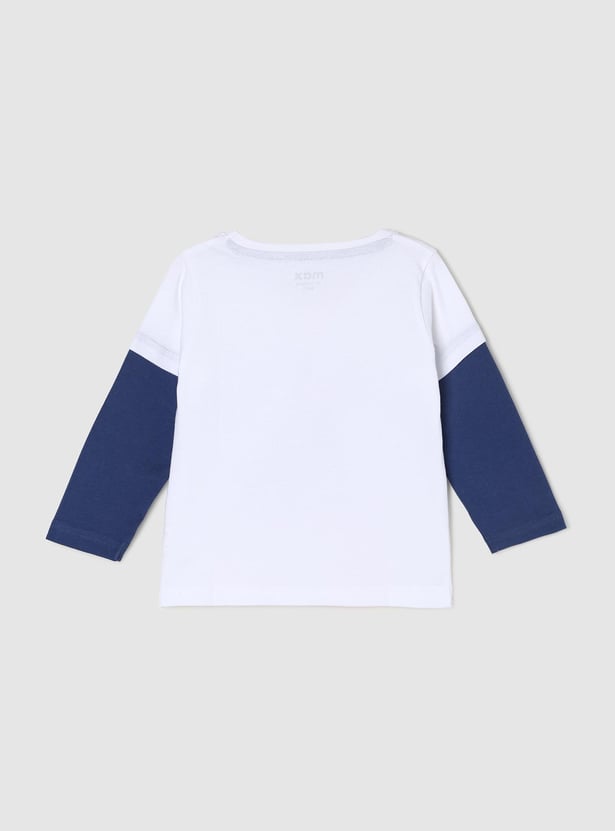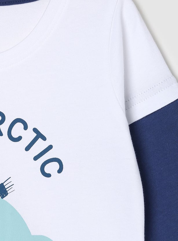 Update his winter wardrobe with this T-shirt featuring a crew neckline, double sleeves in a colourblock design, and a graphic print on the front.