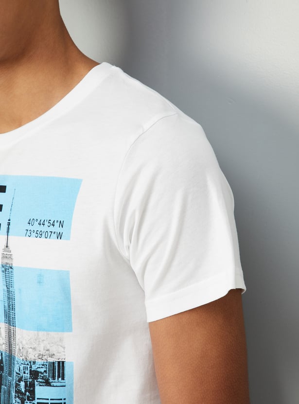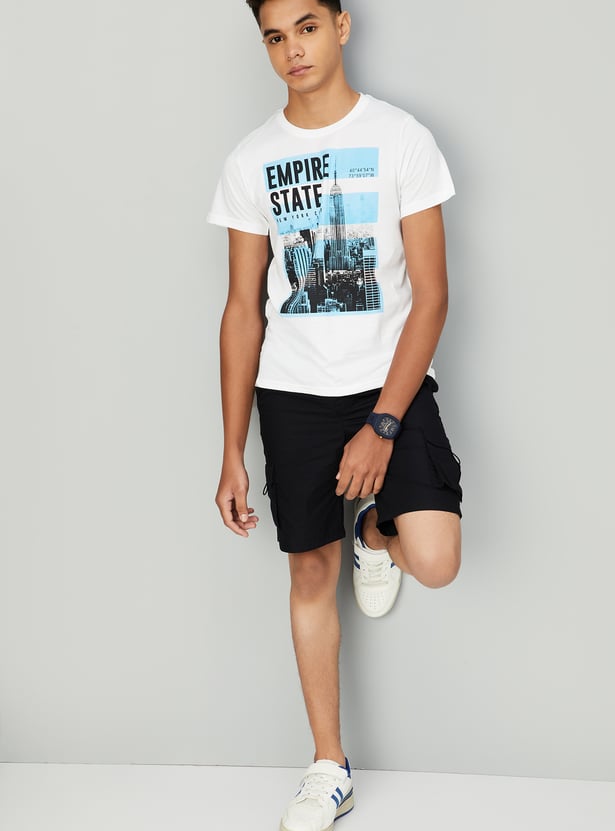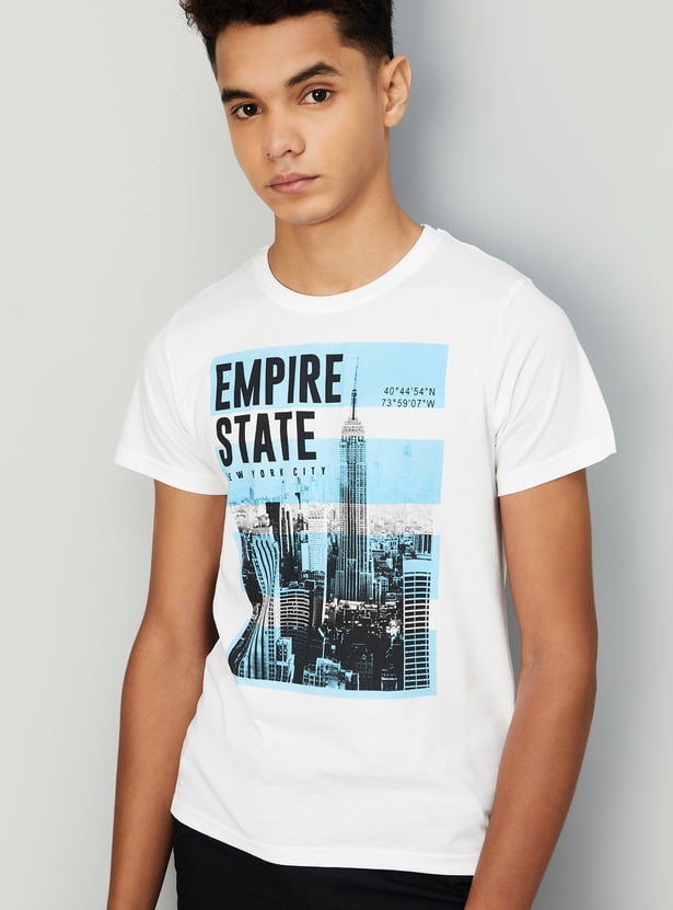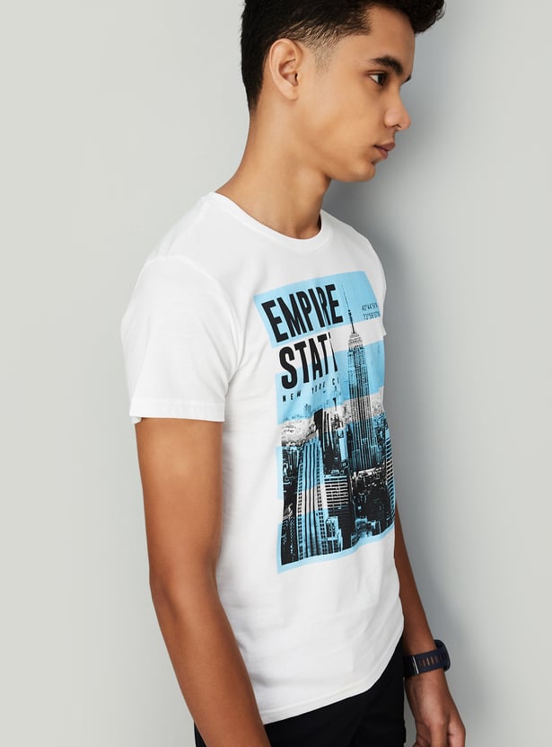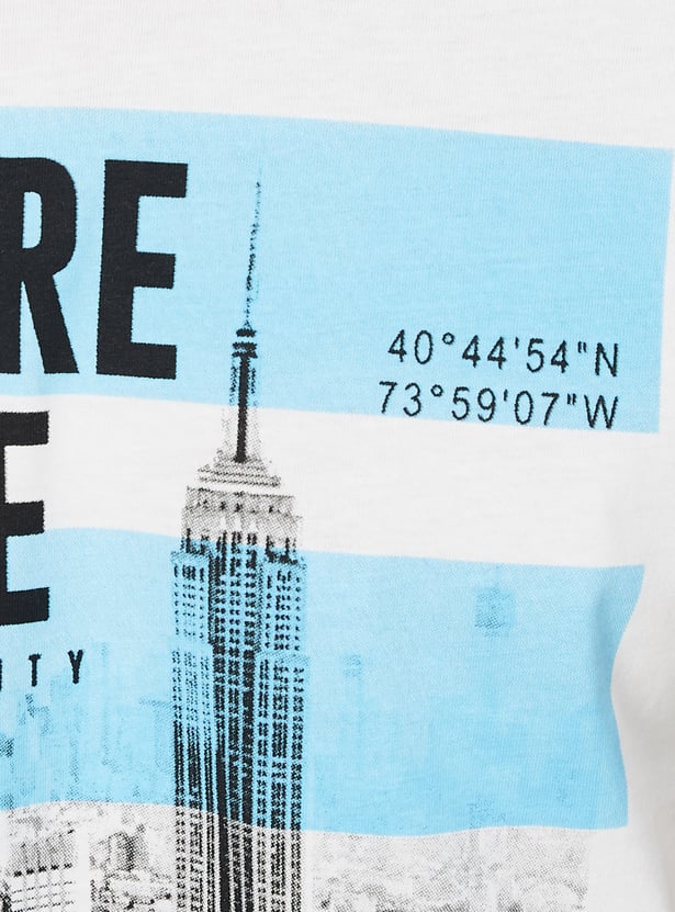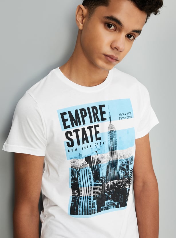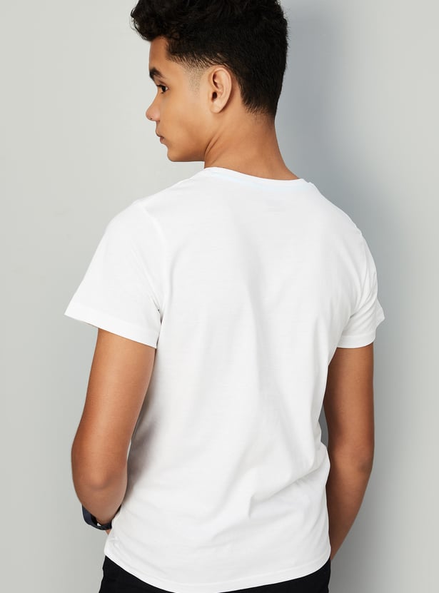 A perfect addition to your kid's summer collection is this T-shirt highlighted with graphic print. It features a crew neck and short sleeves.