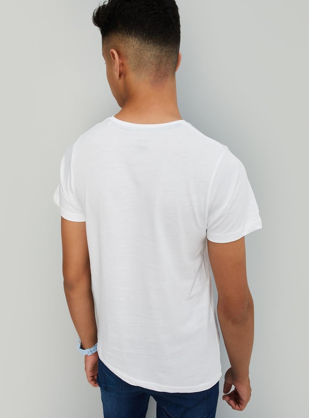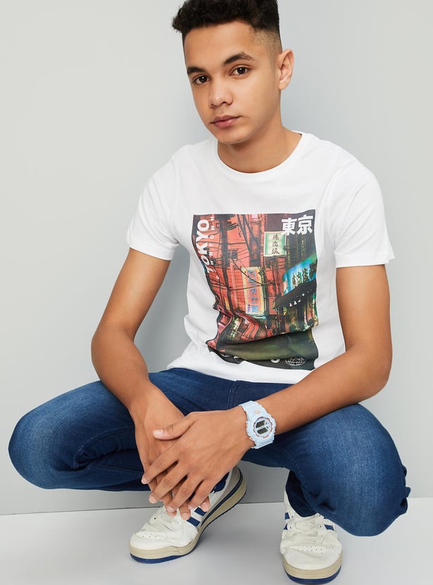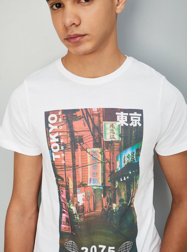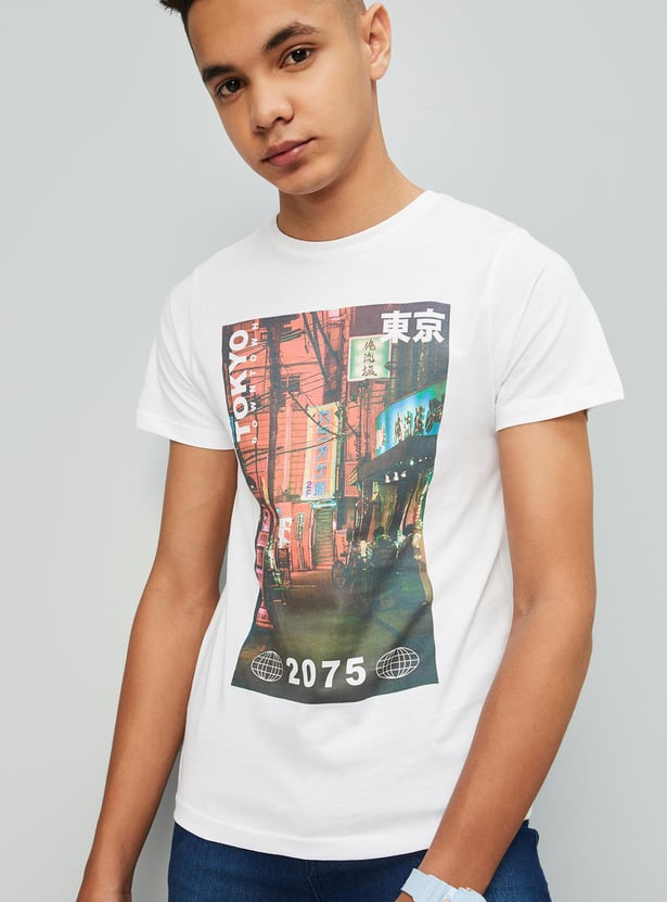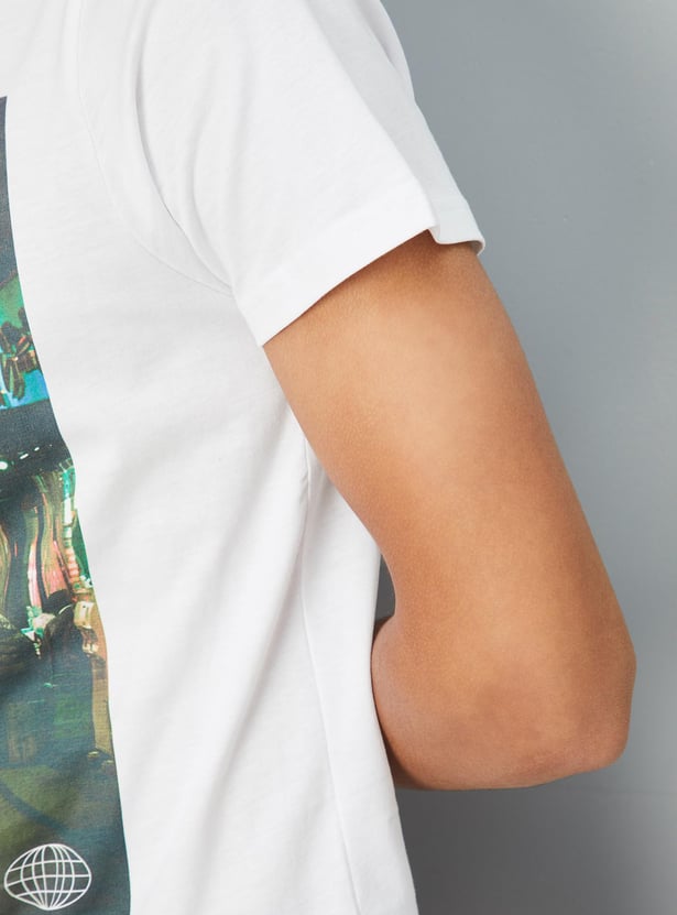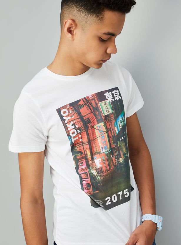 Get your little one vacation-ready with this comfortable and stylish graphic print T-shirt featuring short sleeves and a crew neck.