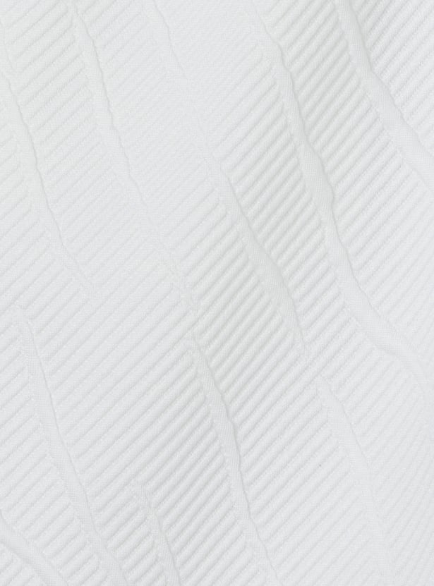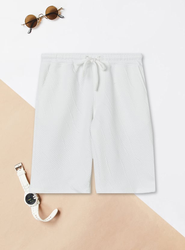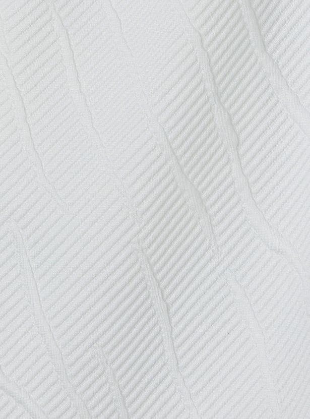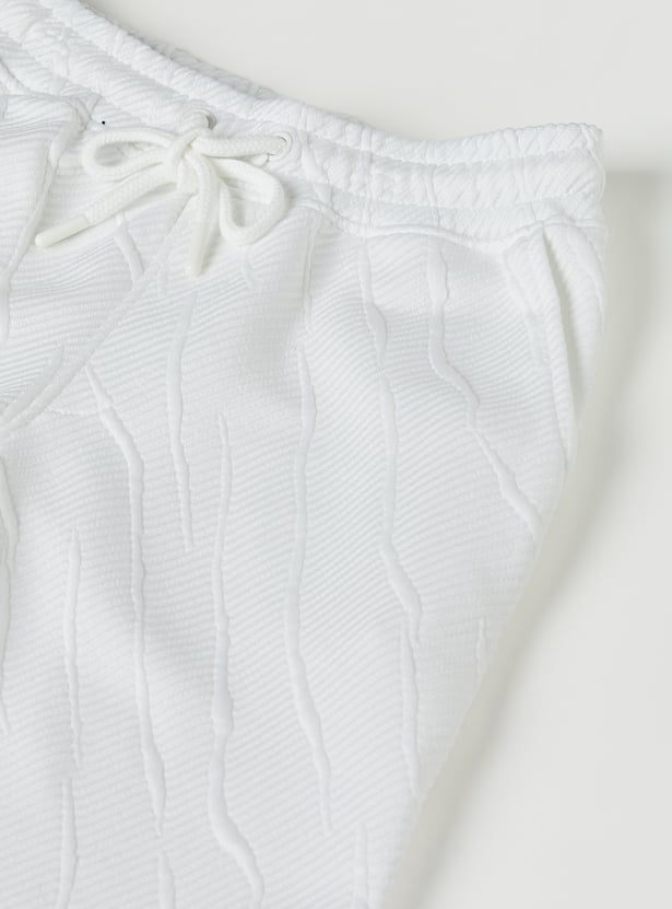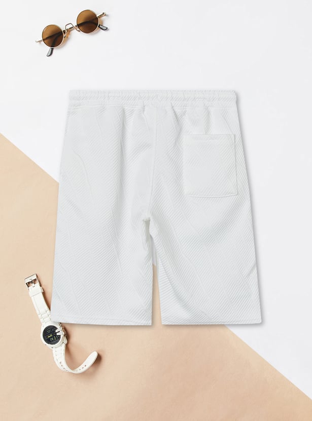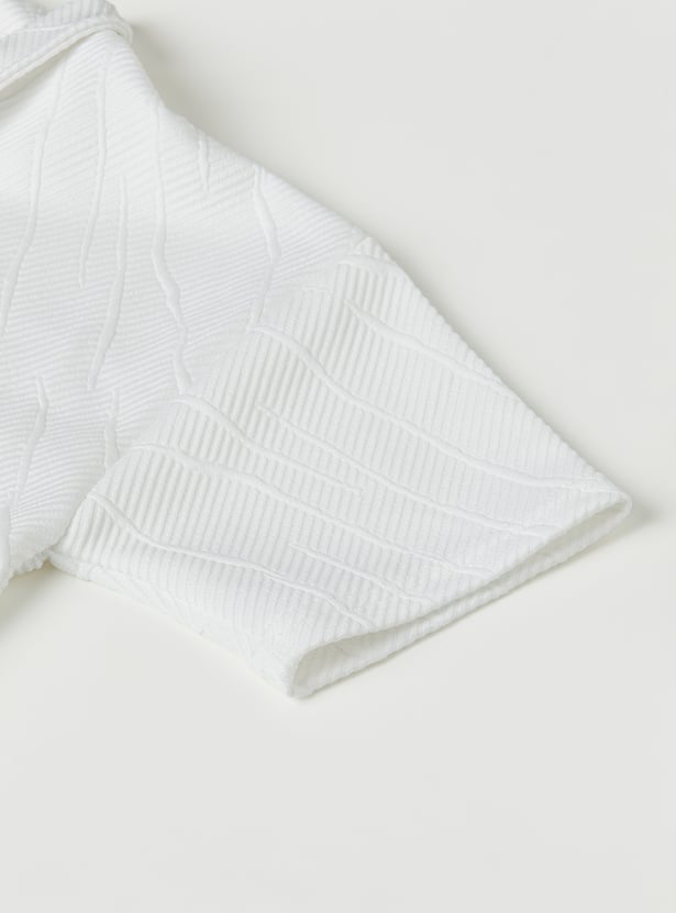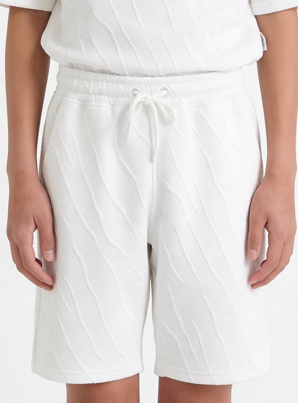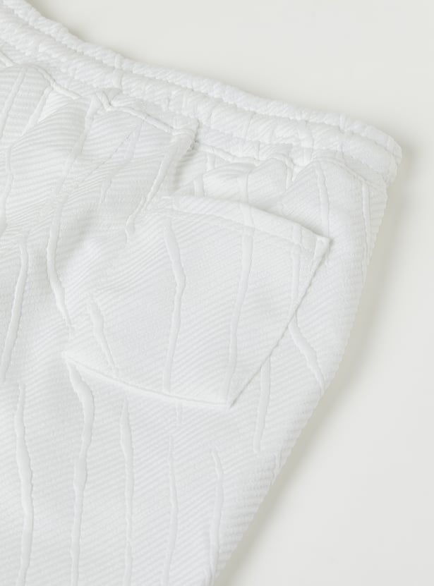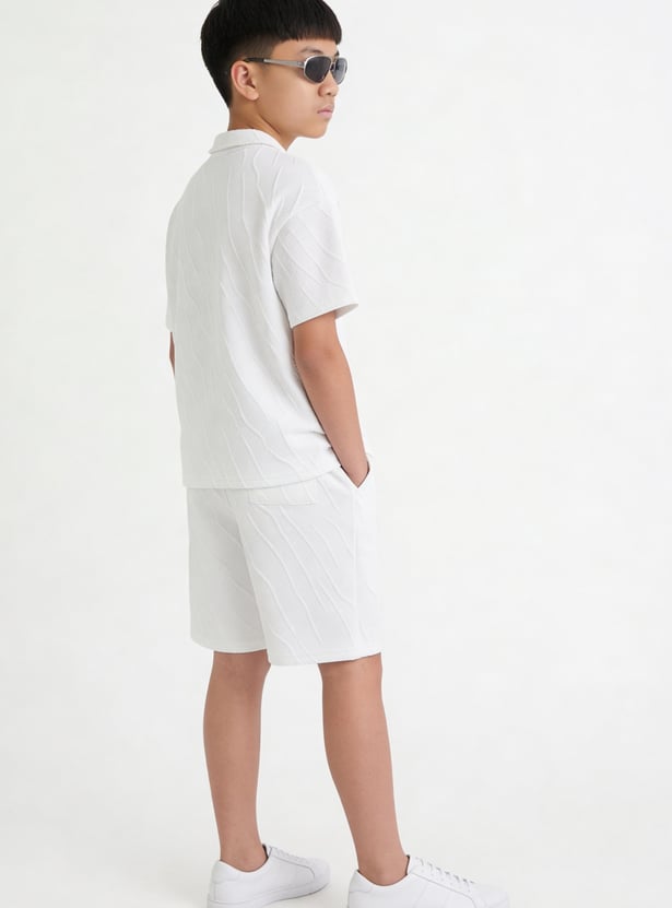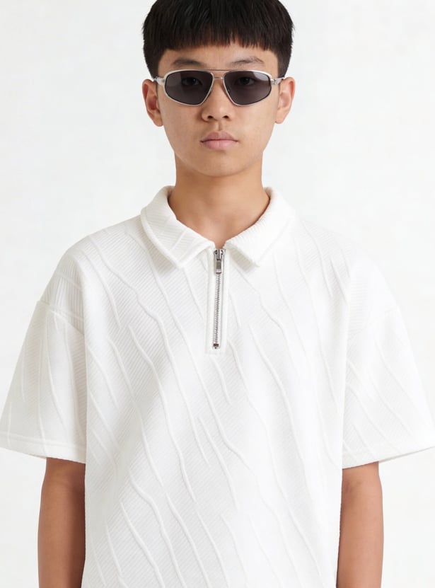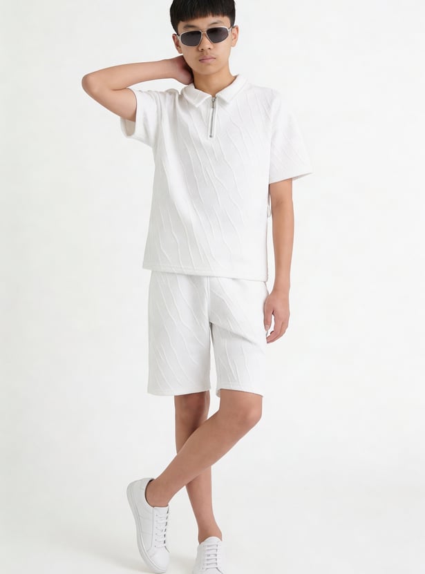 Spruce up your little one's casual wardrobe with the addition of this jacquard t-shirt that features a polo neck, zipper closure and half sleeves. It is complemented by a pair of elasticated shorts.