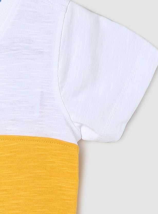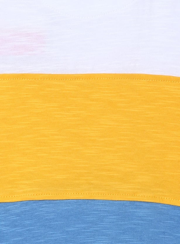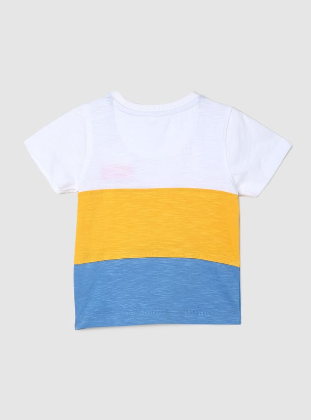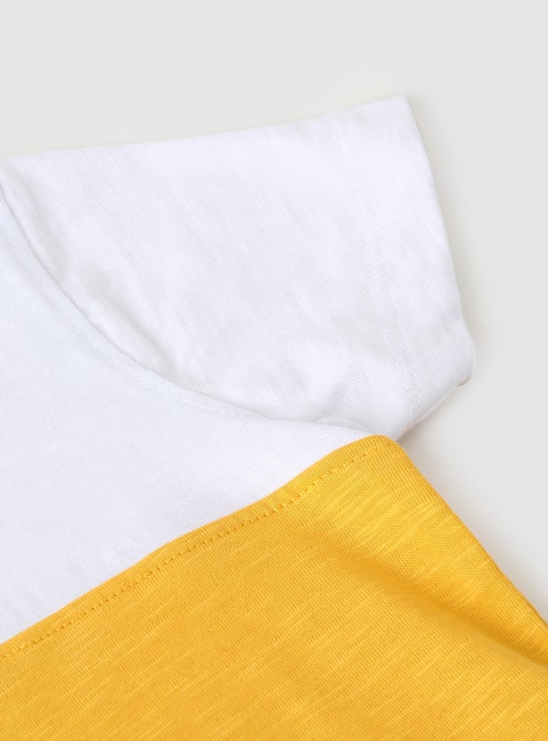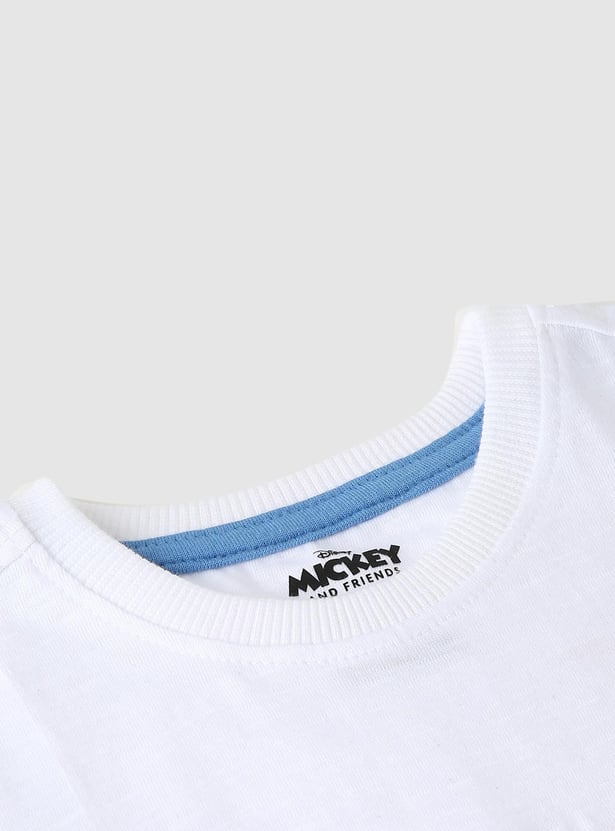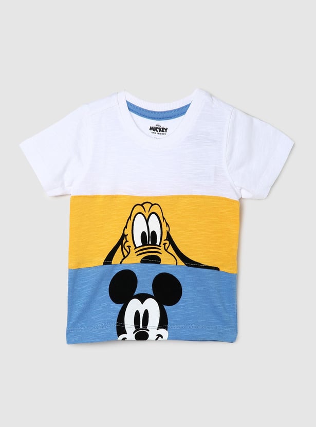 Spruce up your little one’s wardrobe with this T-shirt. It features a crew neck, short sleeves, a colour block design, and a Mickey and Goofy print at the front.