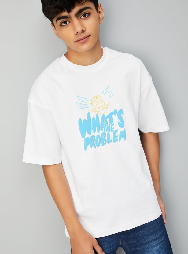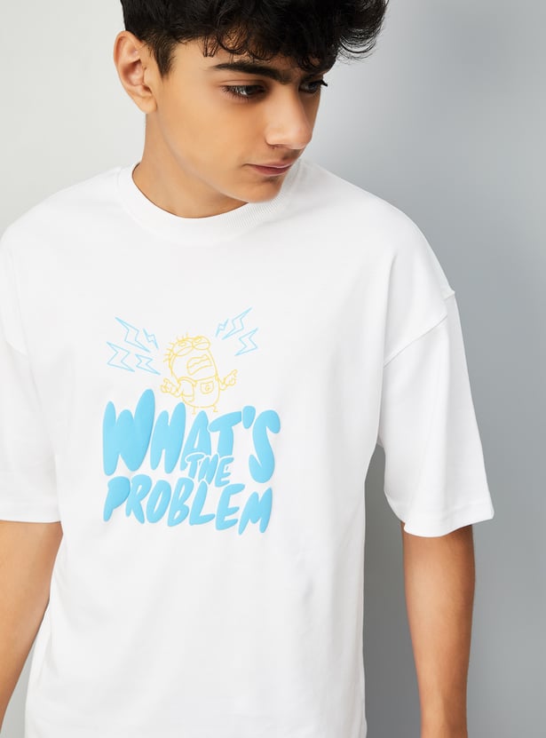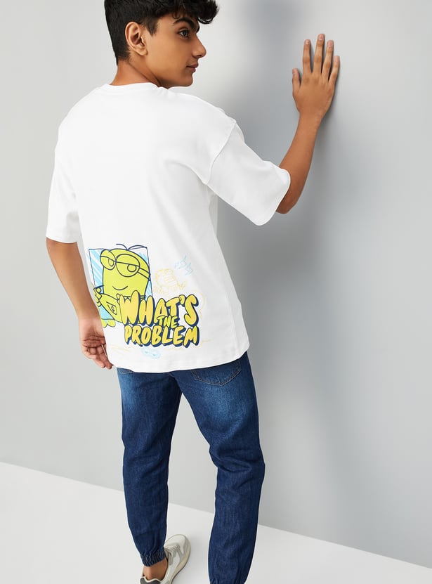 Bring playful charm to your casual look with this Minion print oversized T-shirt. Featuring a classic crew neck and half sleeves, it offers all-day comfort with a dose of animated fun.