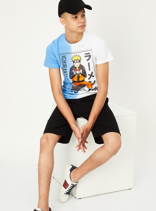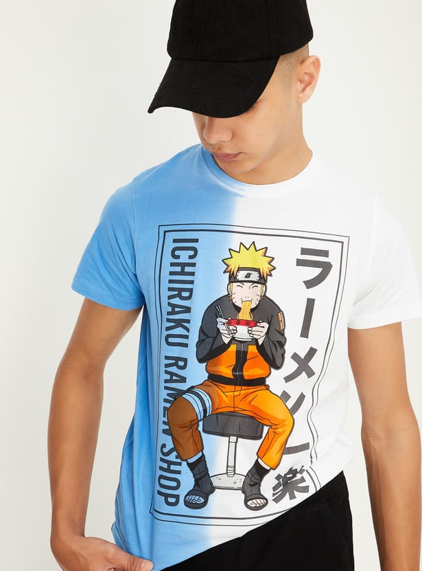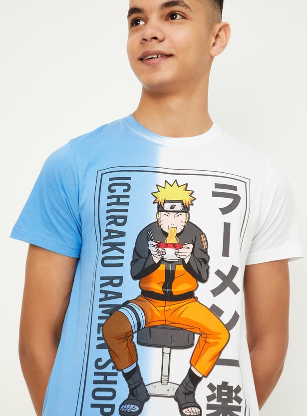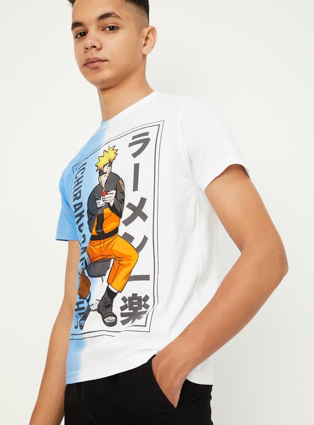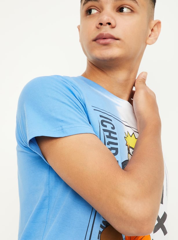 Add a fun twist to your kid's casual wardrobe with this T-shirt. It is styled with a Naruto print, a crew neck, and half sleeves.