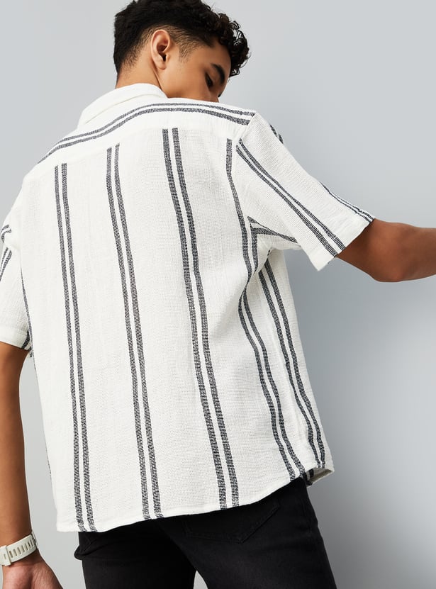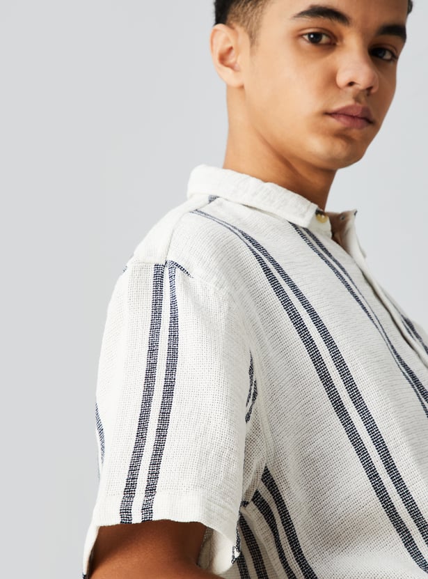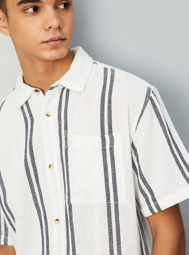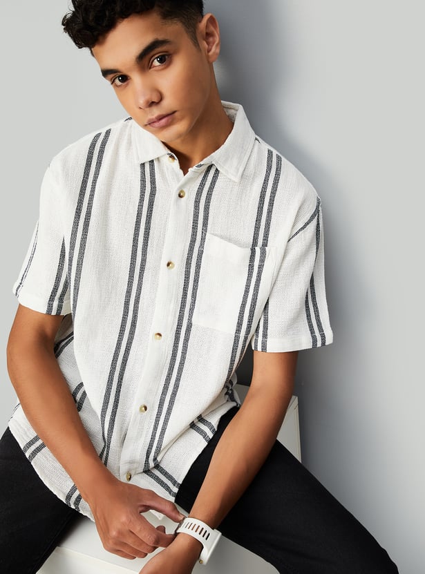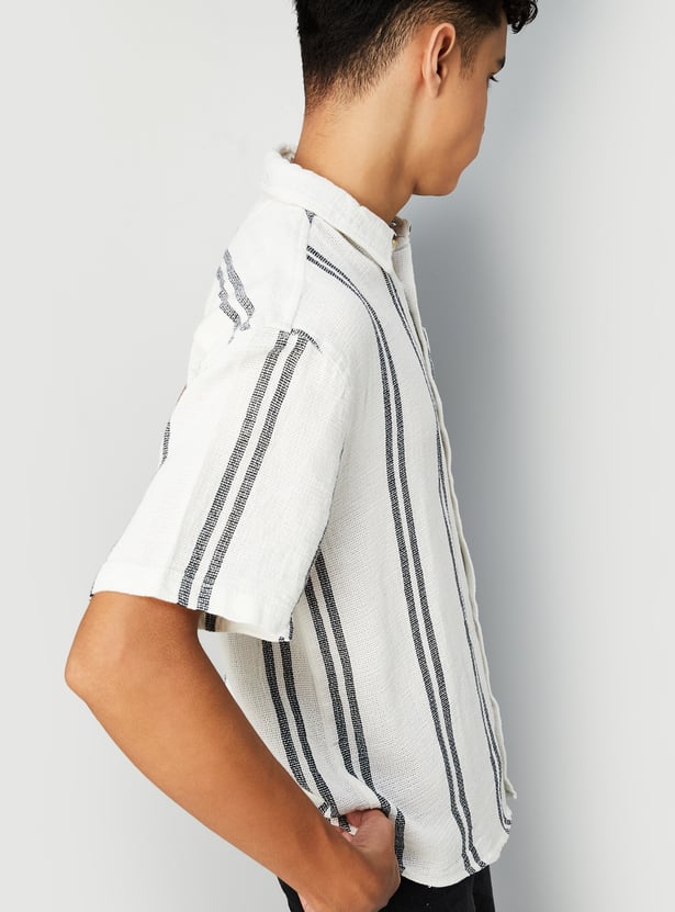 Elevate your kid's wardrobe with this smartly designed shirt. It features a stylish striped pattern, a spread collar, a patch pocket, and half sleeves, making it perfect for any occasions.