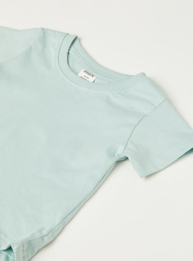 Add a fun, coordinated touch to your wardrobe with this printed dungaree and T-shirt set. The dungaree features a square neck with suspenders and button closure, giving it a playful yet structured look. It’s paired with a classic crew-neck T-shirt with half sleeves, ensuring comfort and versatility.