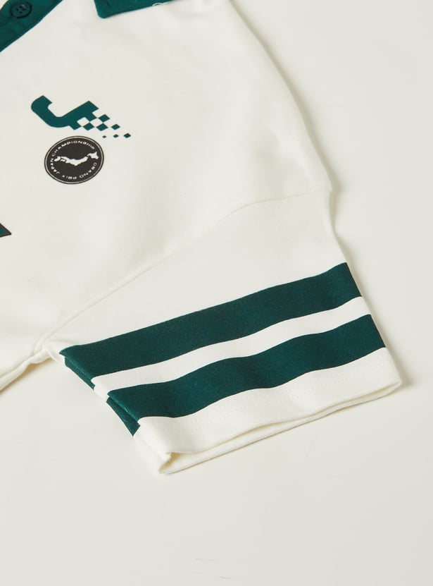 This printed polo T-shirt features a classic spread collar, half sleeves, and a neat button yoke that adds structure to the silhouette. The sporty print brings energy, making it a polished yet easy option for everyday wear.