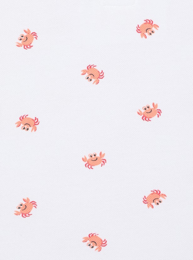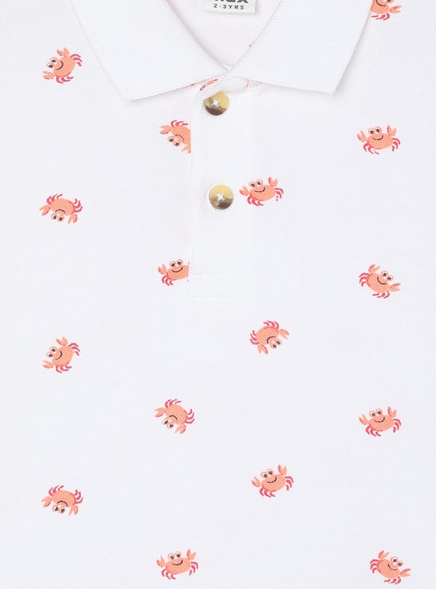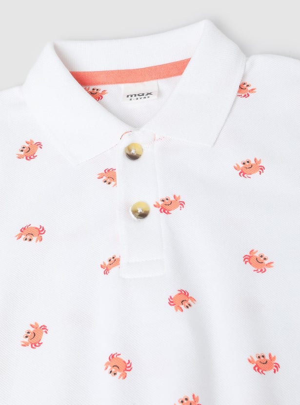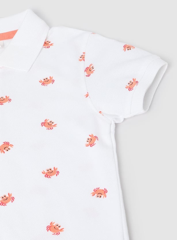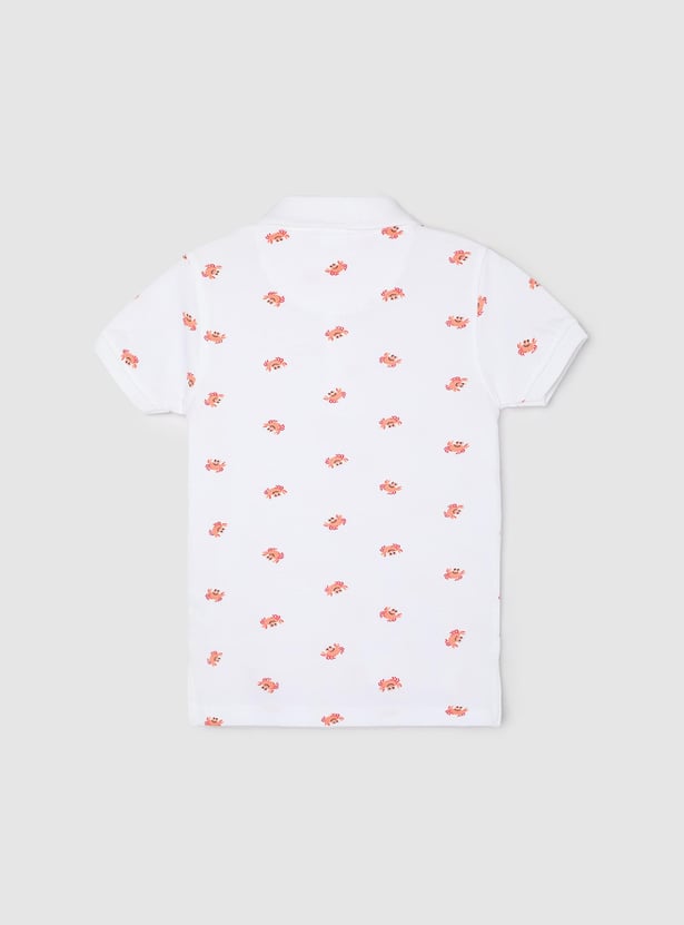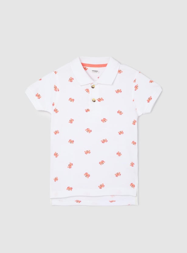 Add some flair to your kid's casual wardrobe with this T-shirt featuring all-over prints. It has ribbed trim, short sleeves, a polo collar, and side slits at the hem.