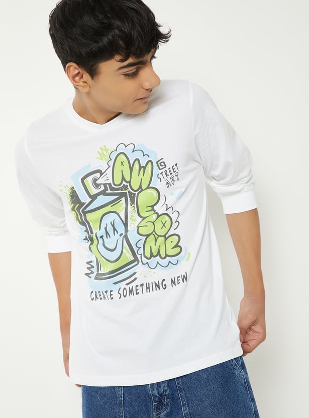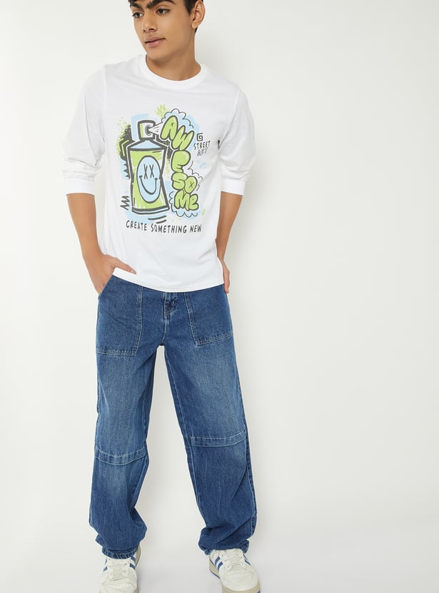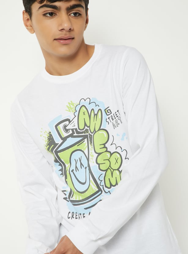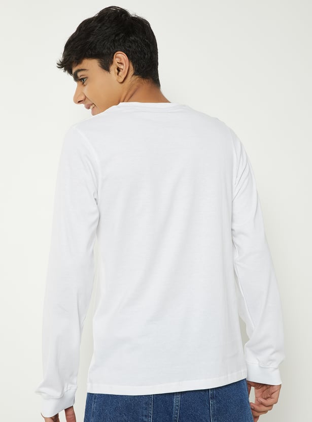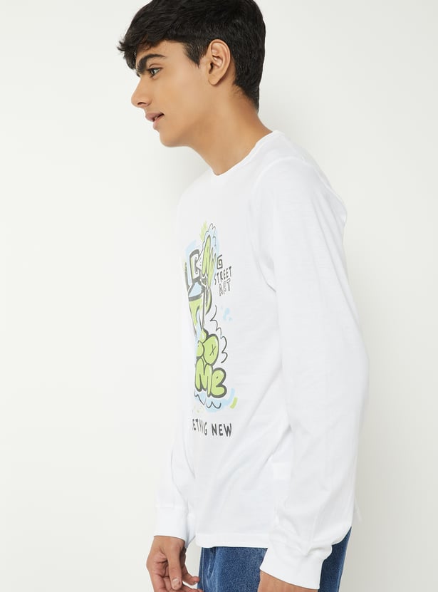 This printed T-shirt features a classic crew neck and full sleeves, offering a comfortable fit with a touch of everyday personality. Lightweight and versatile, it's easy to wear solo or layer up.