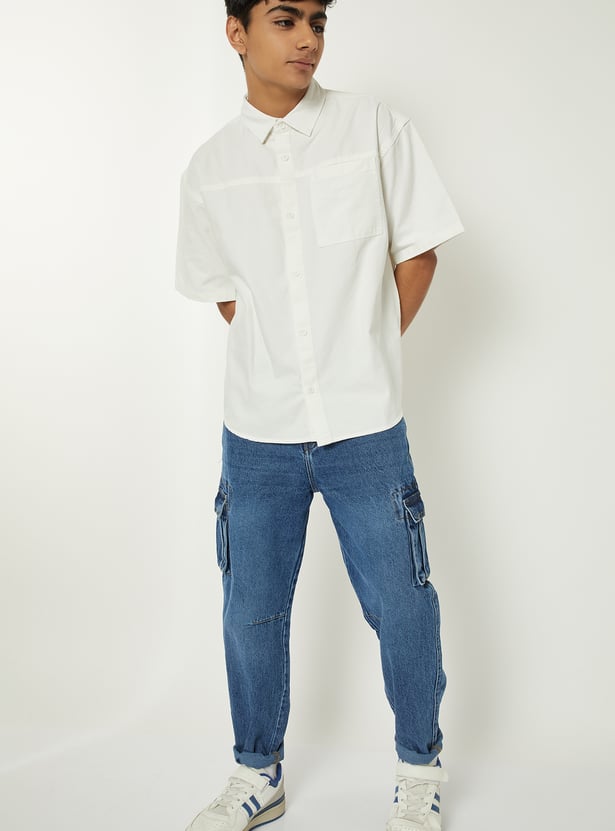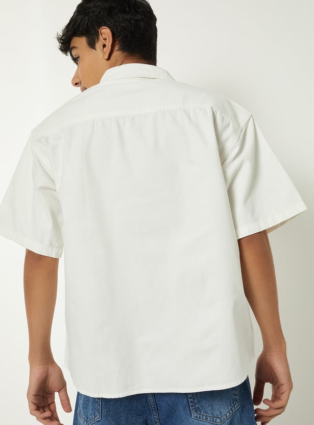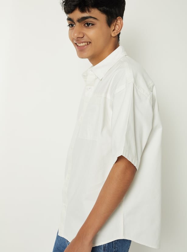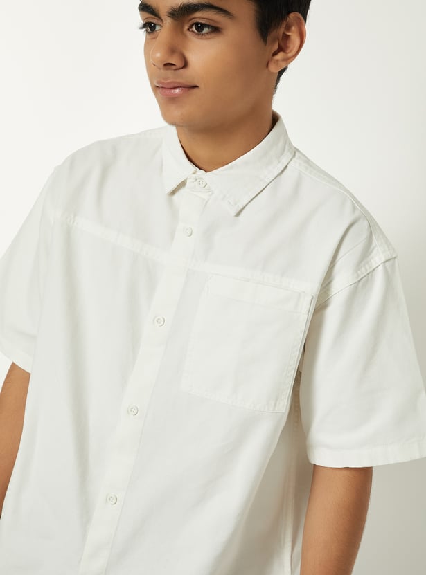 Give your casual wardrobe a fresh update with this solid shirt featuring a spread collar, neat button placket, and breezy half sleeves.