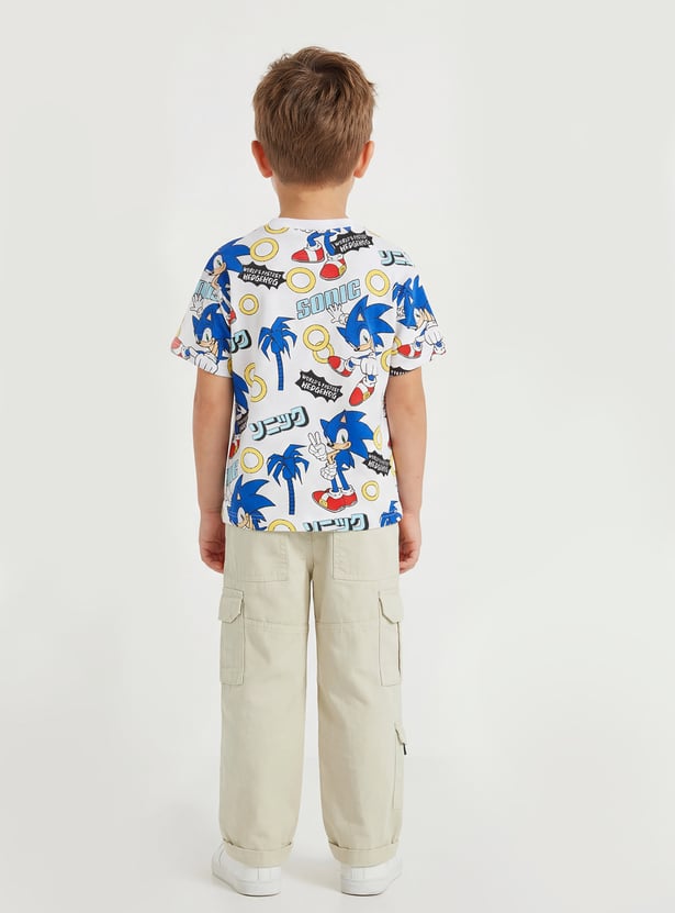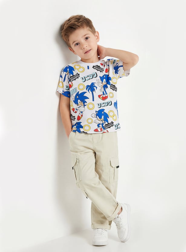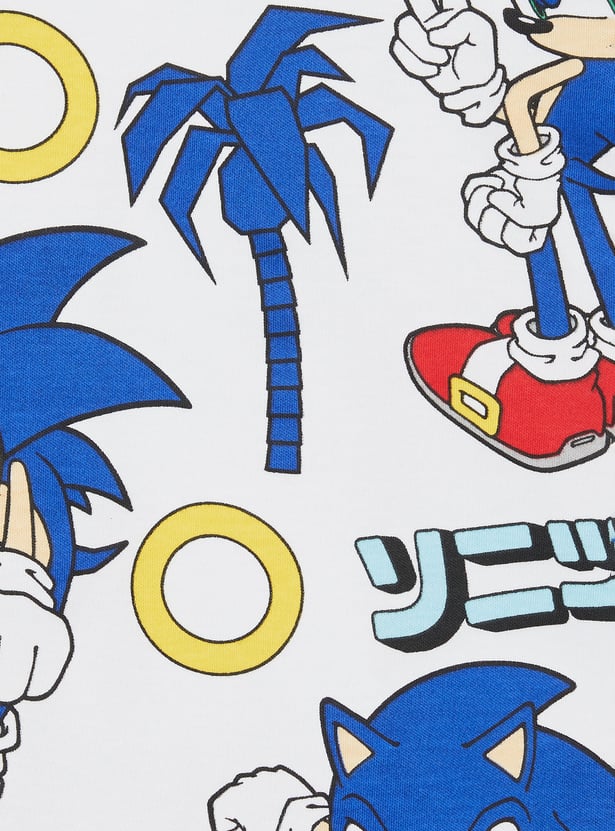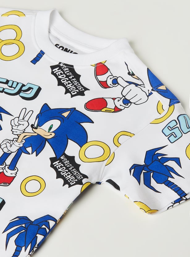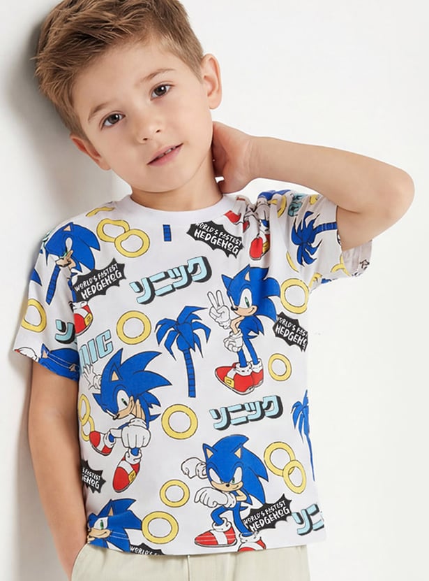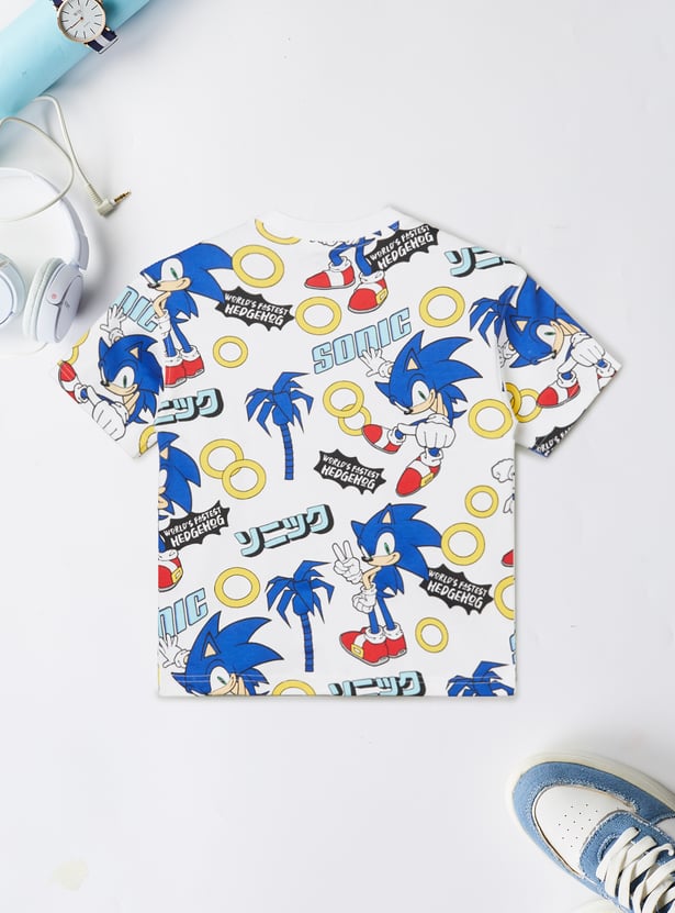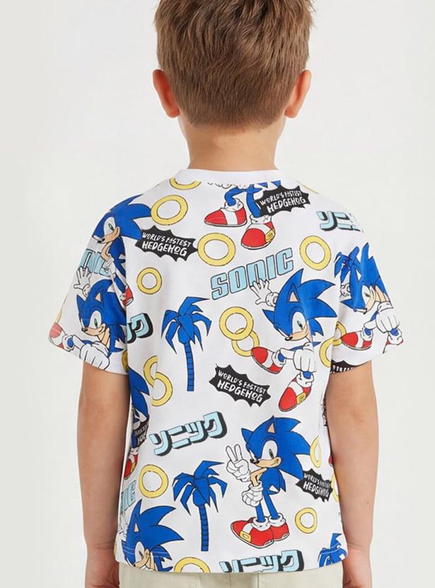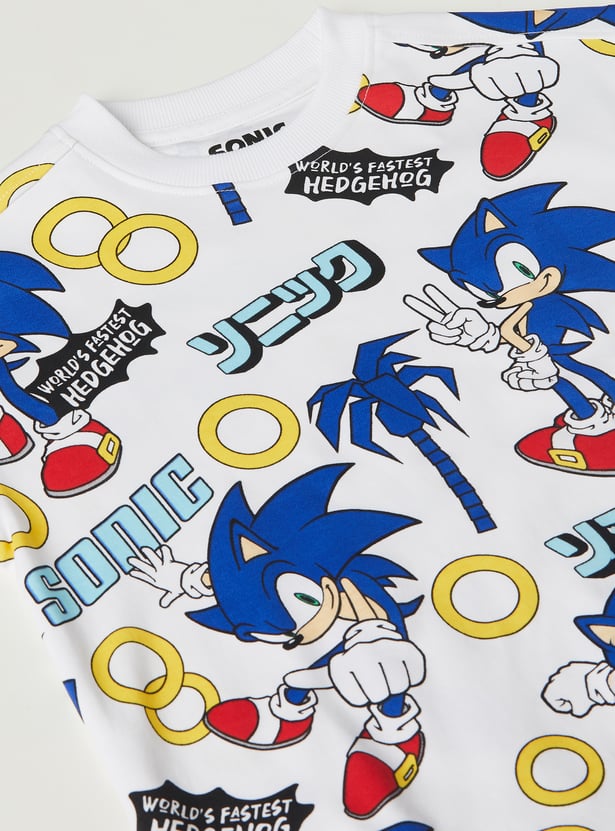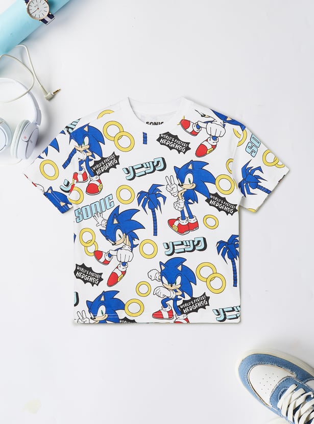 Level up his everyday style with this T-shirt. It features an all-over Sonic-inspired print that adds a bold, playful touch. Designed with a classic crew neck and comfortable half sleeves, it offers an easy fit for all-day wear.