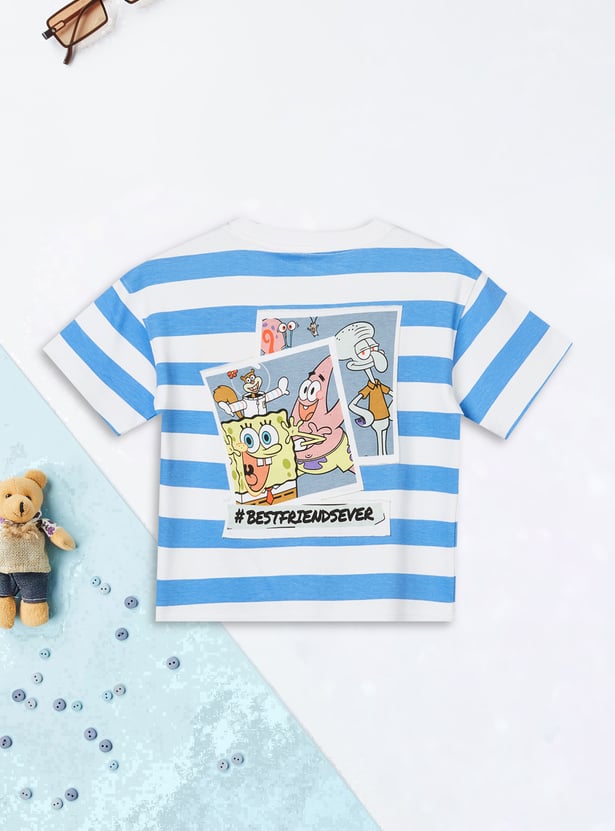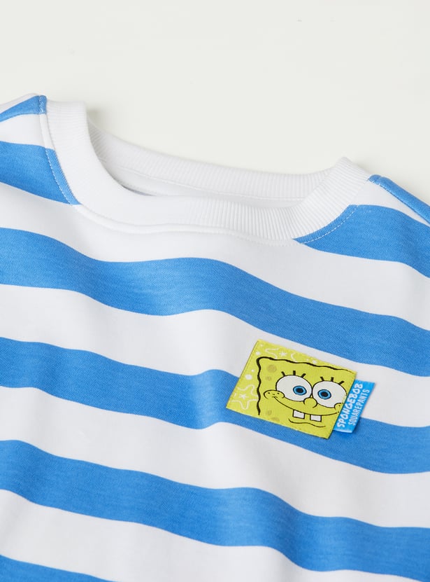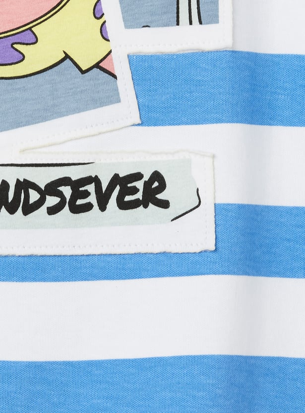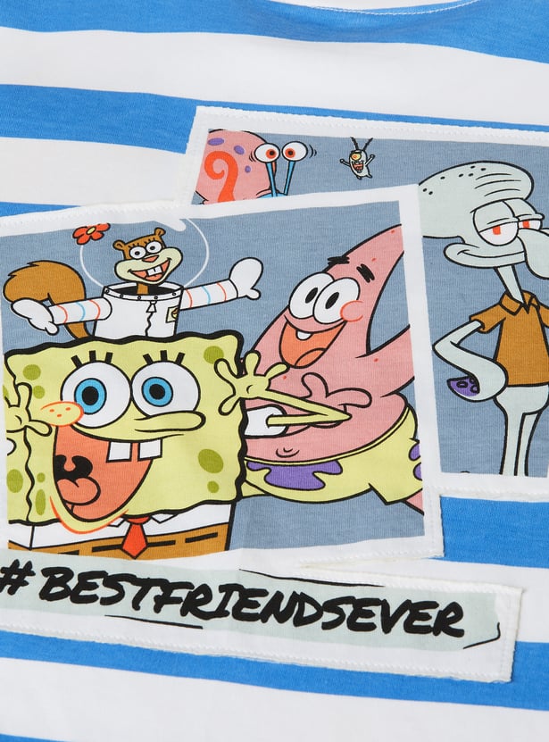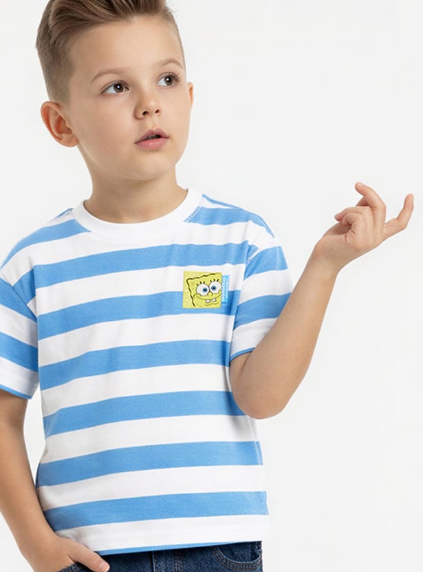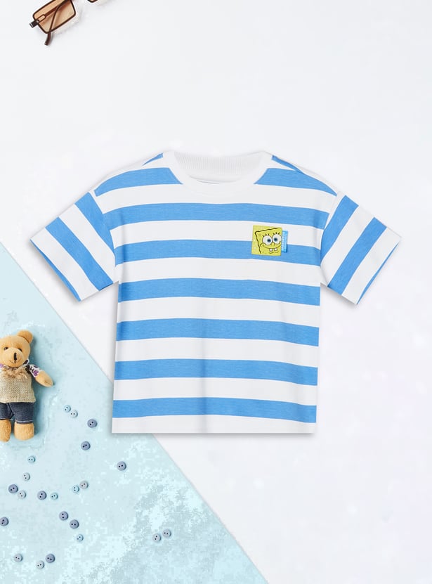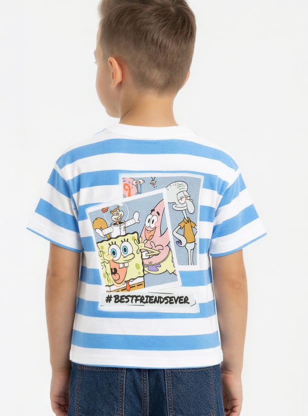 This SpongeBob SquarePants striped T-shirt is a fun and casual piece with a playful vibe. Featuring a crew neck and half sleeves, it offers a comfortable fit and a timeless silhouette.