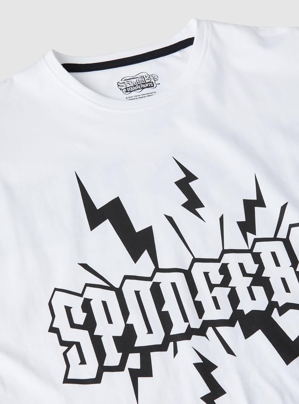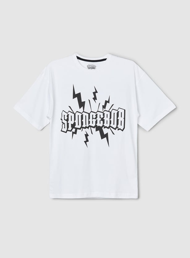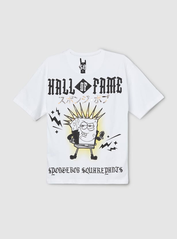 Dive into the whimsical underwater world with this T-shirt. The Spongebob-themed prints give a quirky flair. The oversized design offers roomy comfort. This tee is designed with a crew neck, drop shoulders, and half sleeves.