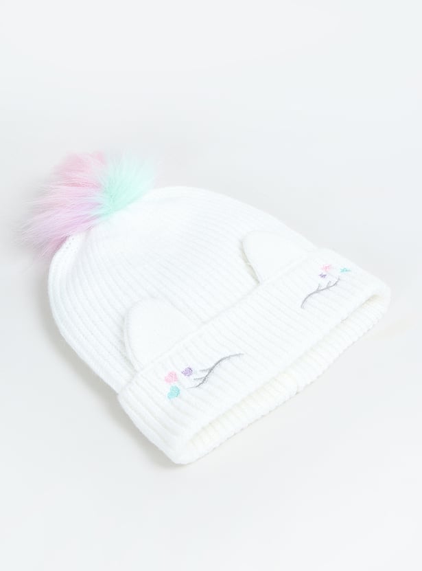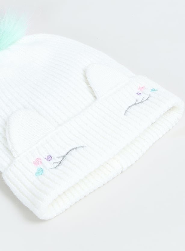 Stay snug and stylish with this applique beanie featuring a playful pom-pom detail and cozy knit texture.