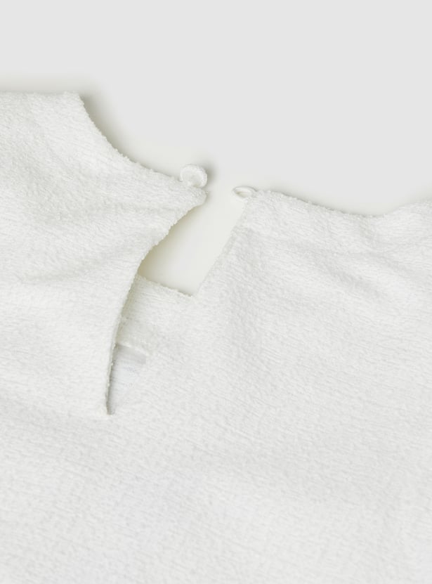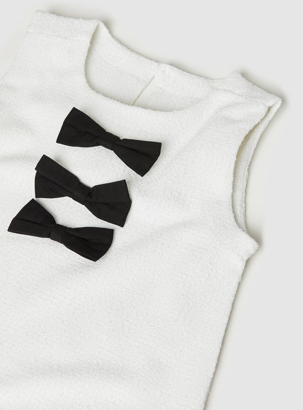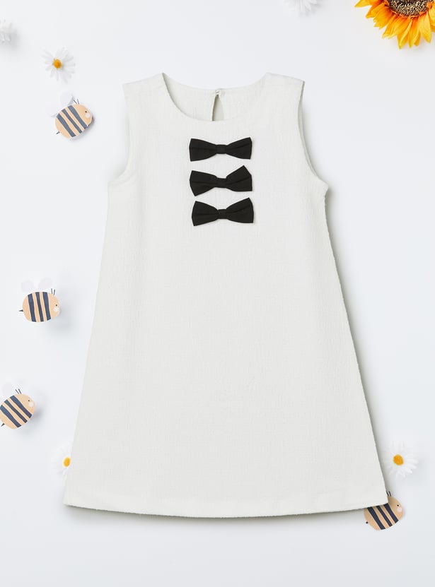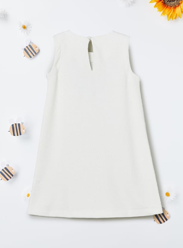 Bring charm to your wardrobe with this applique dress featuring a round neck, sleeveless design, and button closure for easy wear. Perfect for casual outings or playdates.