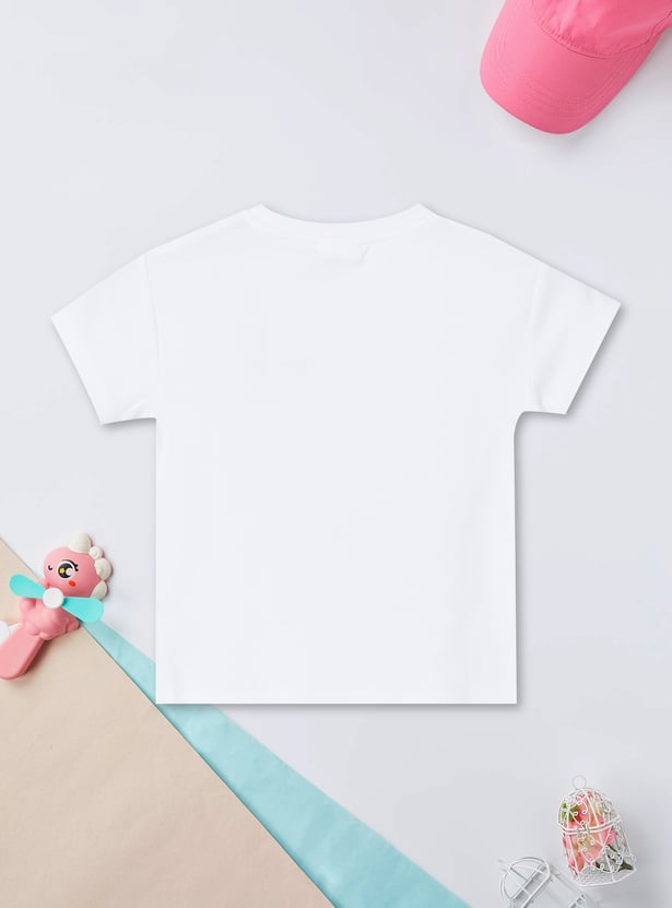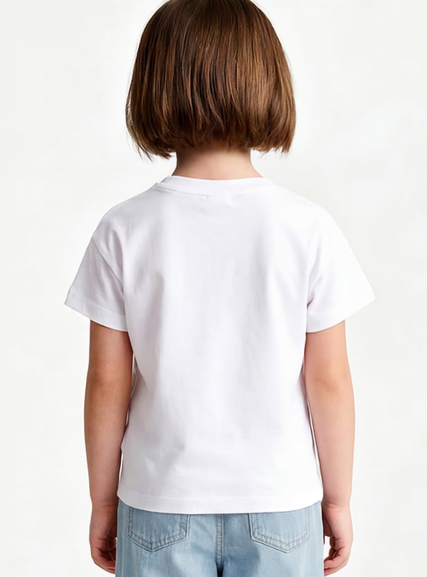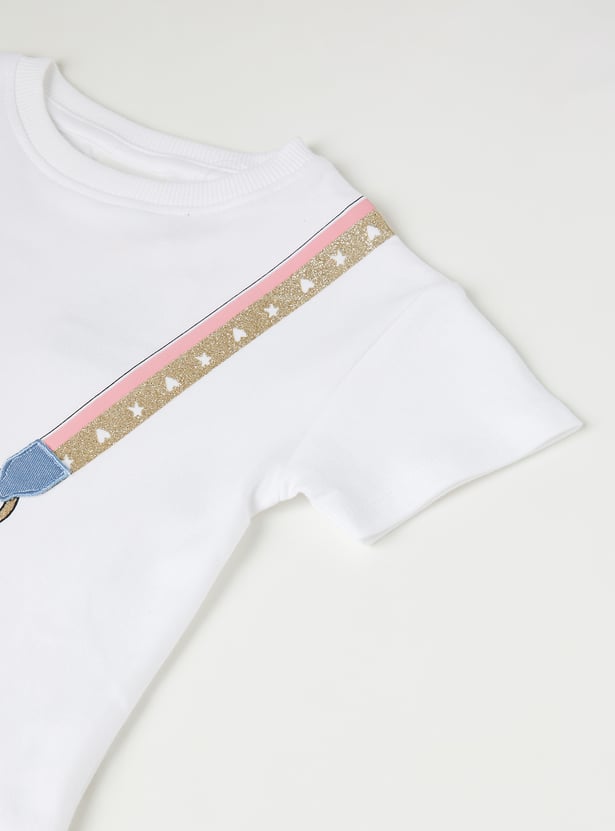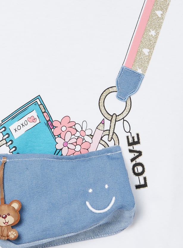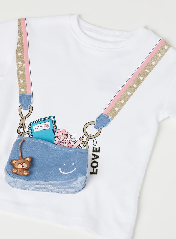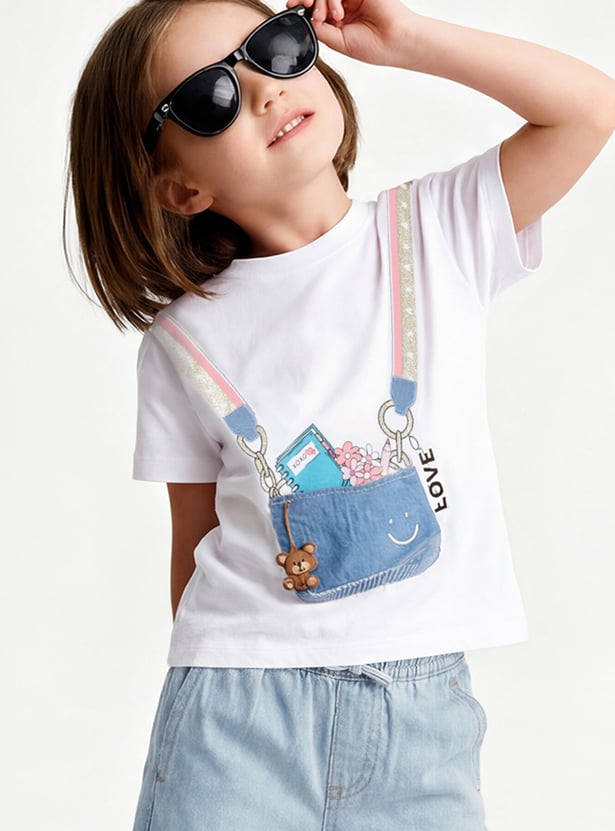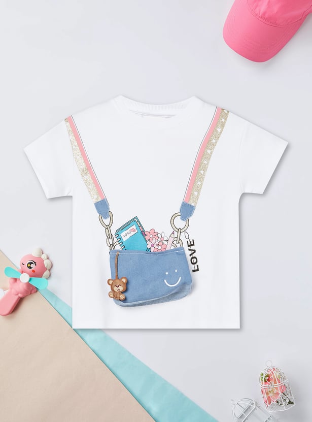 This girls' T-shirt features a charming applique design with intricate detailing. Its round neckline and half sleeves add to its casual appeal. The standout element is the playful bag-inspired applique, making it a fun and unique wardrobe addition.