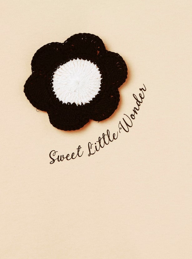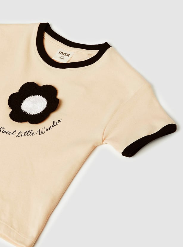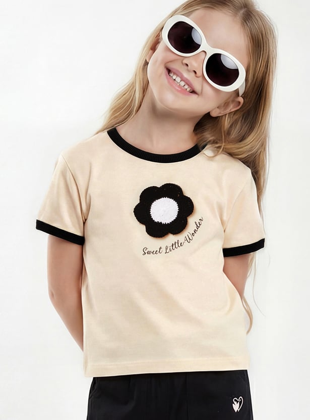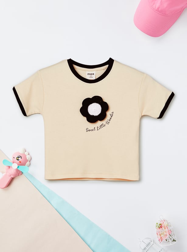 Stylish and unique, this applique t-shirt is designed with a round neck and half sleeves, beautifully adorned with delicate floral appliqué that adds texture and charm to the casual silhouette.