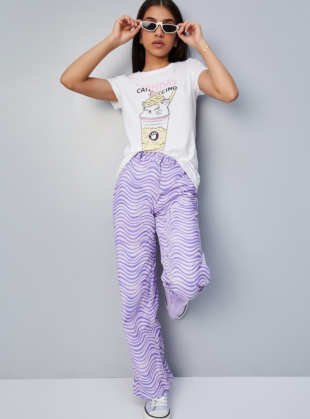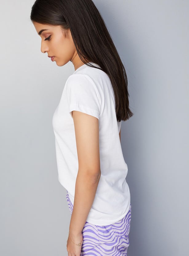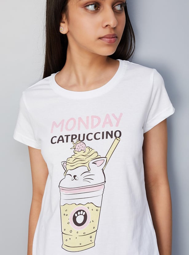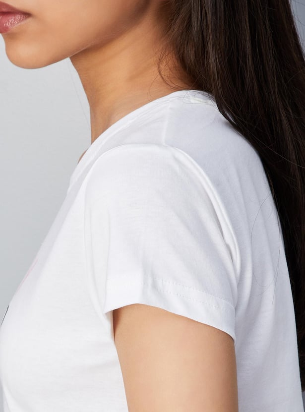 Spruce up her basic style with this T-shirt. It has a round neckline, short sleeves, and a graphic print on the front. Pair this tee with sneakers for an updated street look.