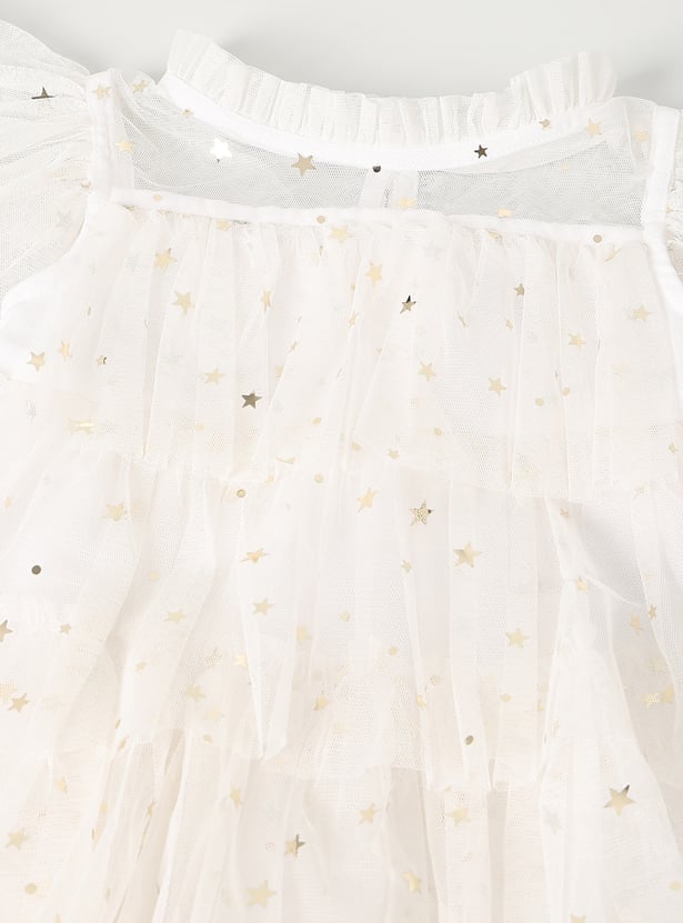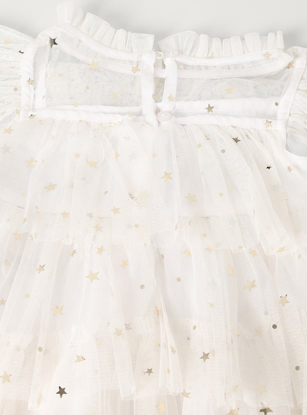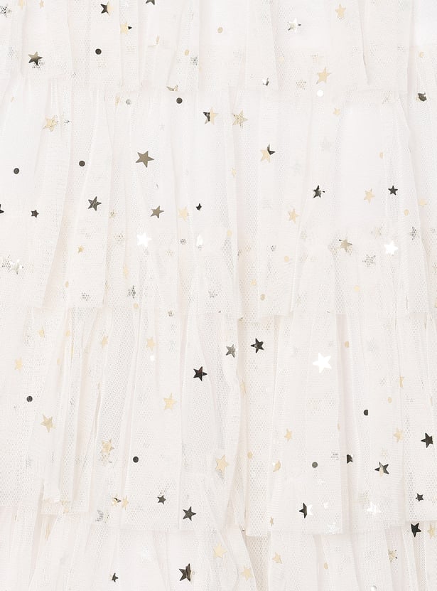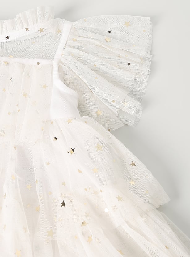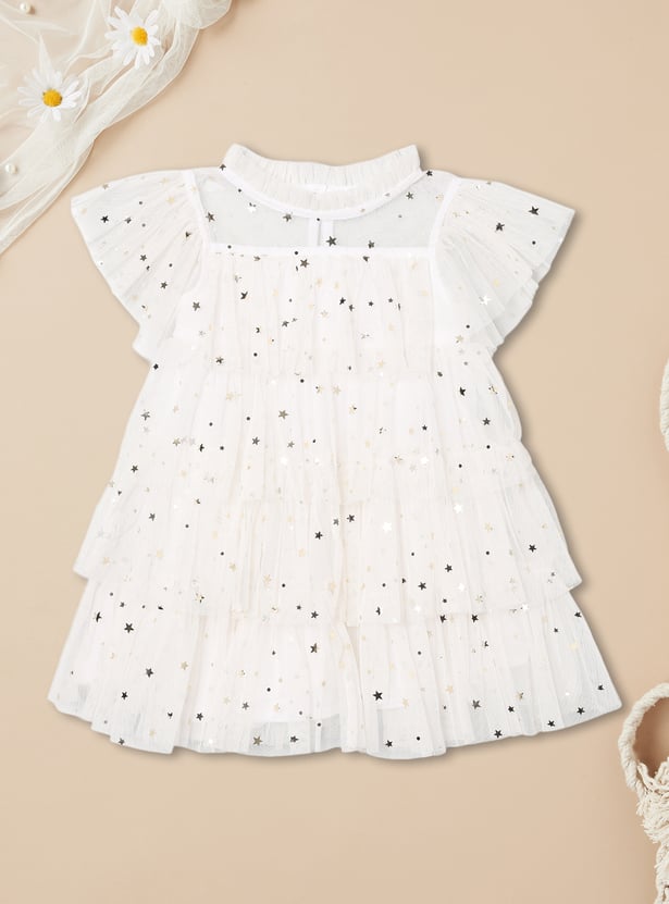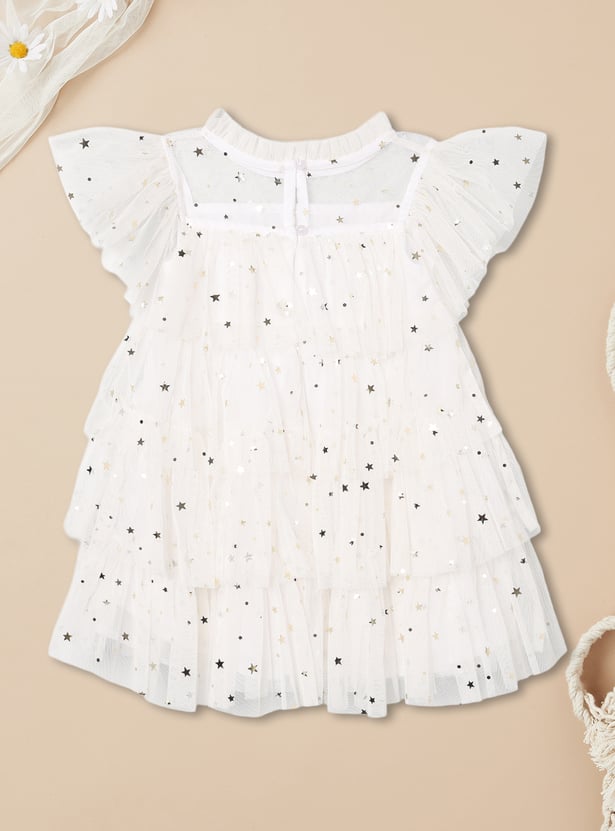 This layered dress shimmers with all-over star-studded embellished detailing for a dreamy finish. Designed with a frilled neck, flutter sleeves, and knee length, it’s perfect for special occasions.