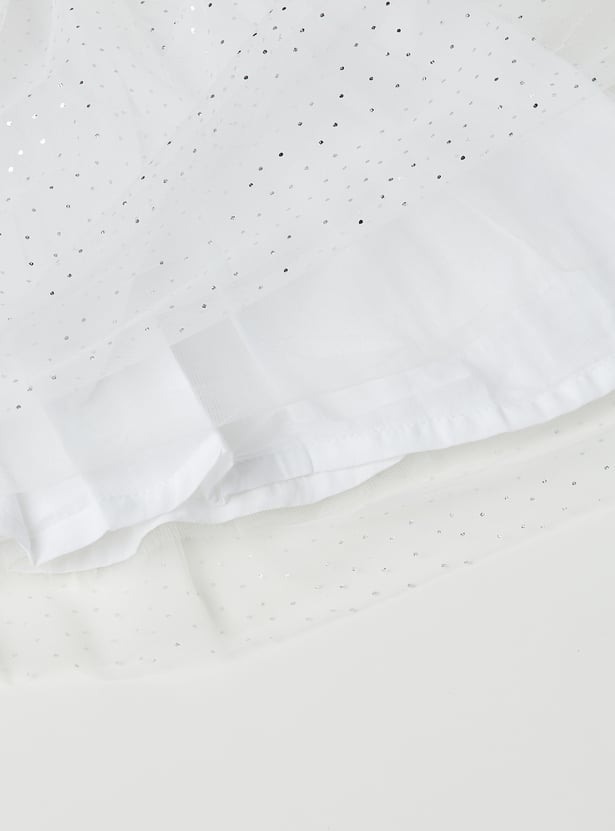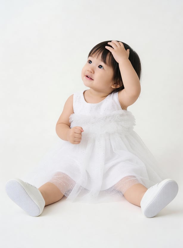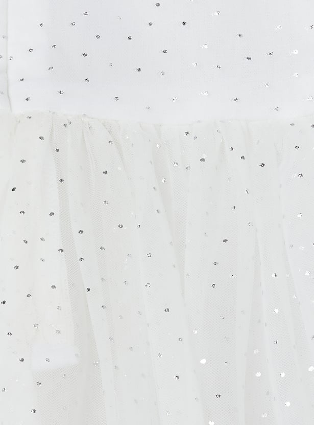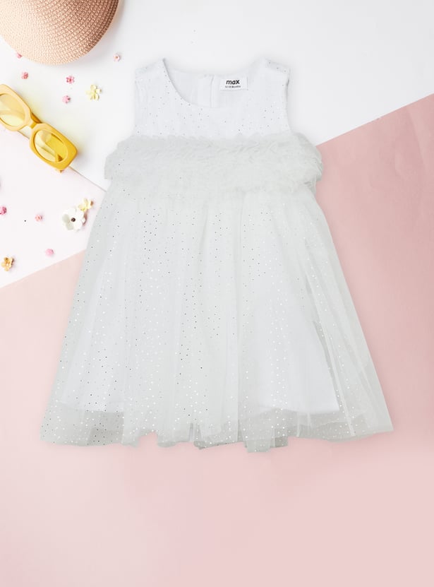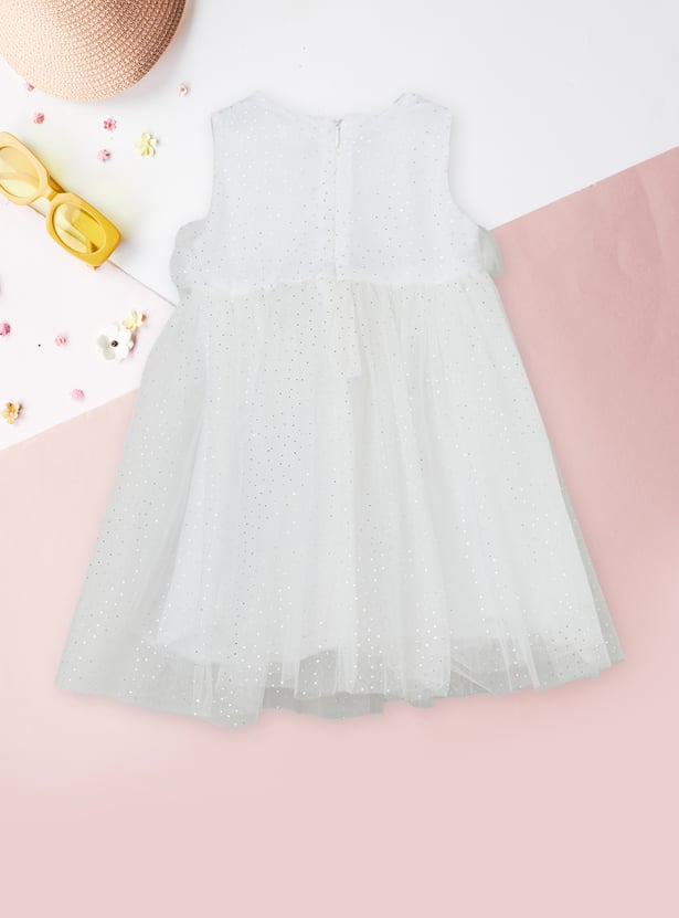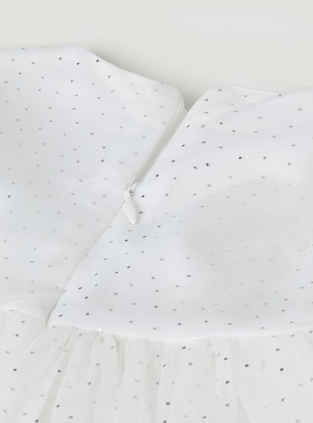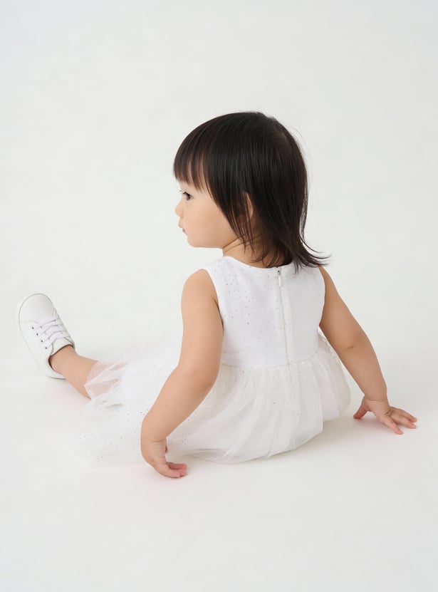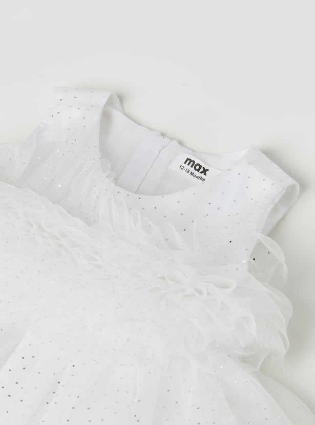 Elegant and dreamy, this embellished tulle dress features a classic round neck and a sleeveless design for a graceful silhouette. Finished with a zip closure, it combines ease of wear with delicate detailing.