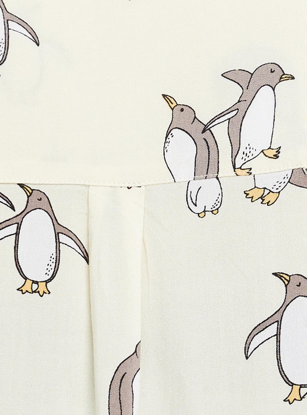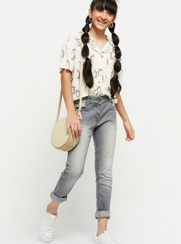 Dress up your girl in the casual comfort, with classic style and appeal. Featuring a smart graphic print shirt, amped up with playful appeal, half sleeves, and lapel collar neck.