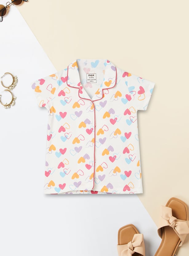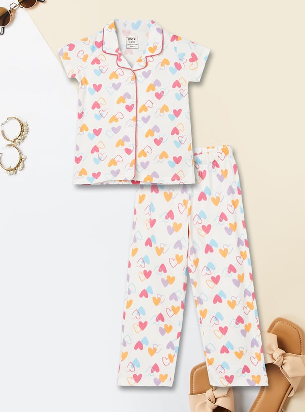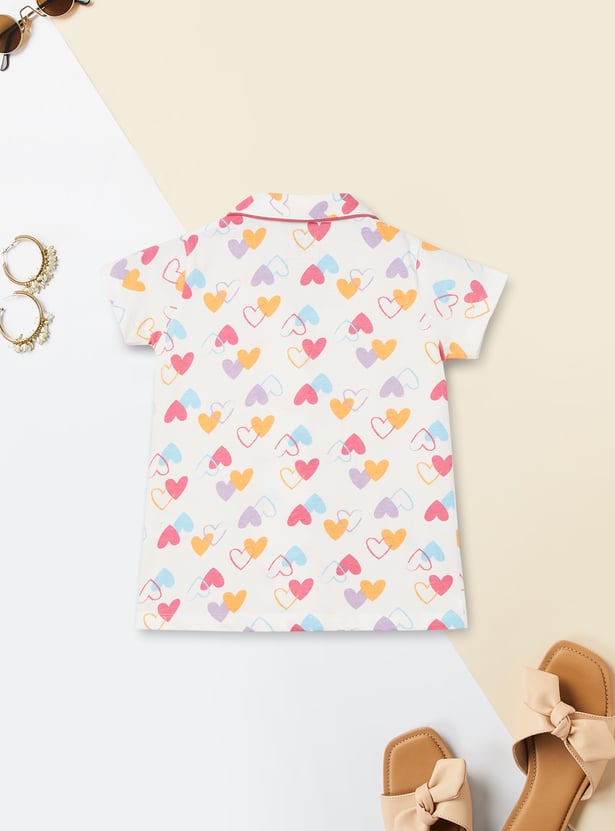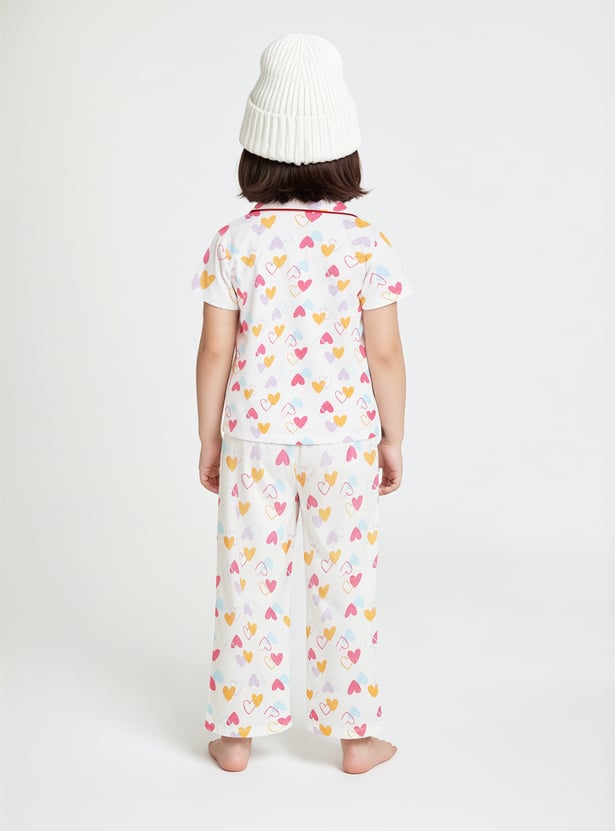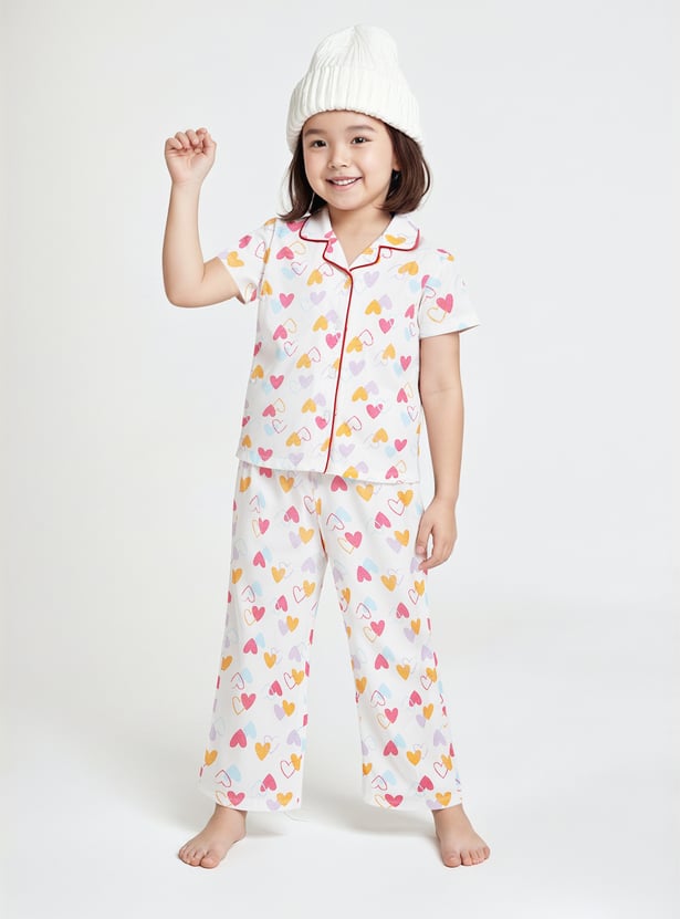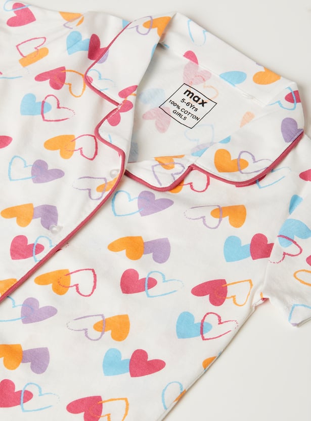 Drift into comfort with this heart print sleepwear set, featuring a collared top with button closure and half sleeves, paired with matching pyjamas with a drawstring waist for the perfect fit.