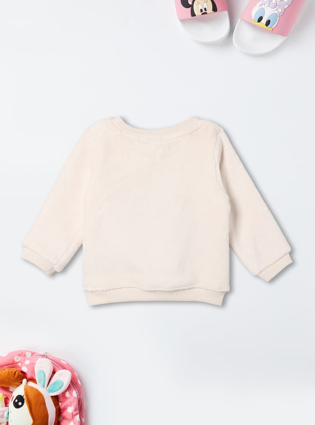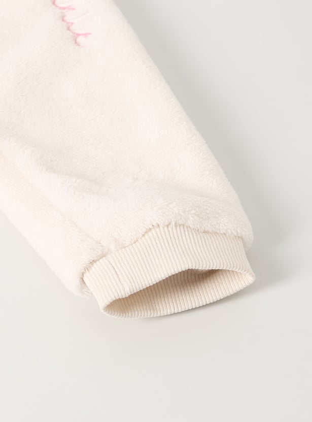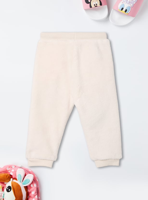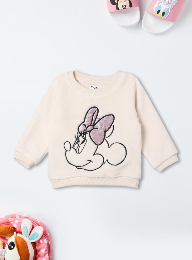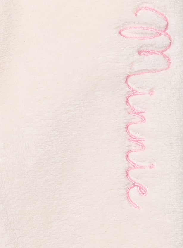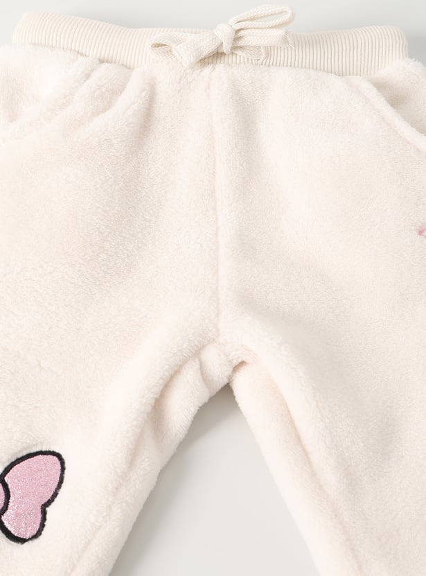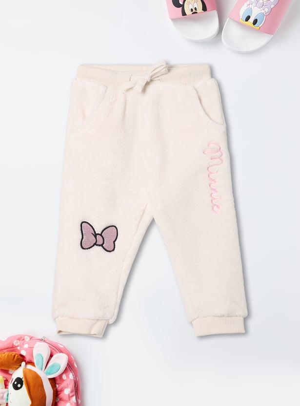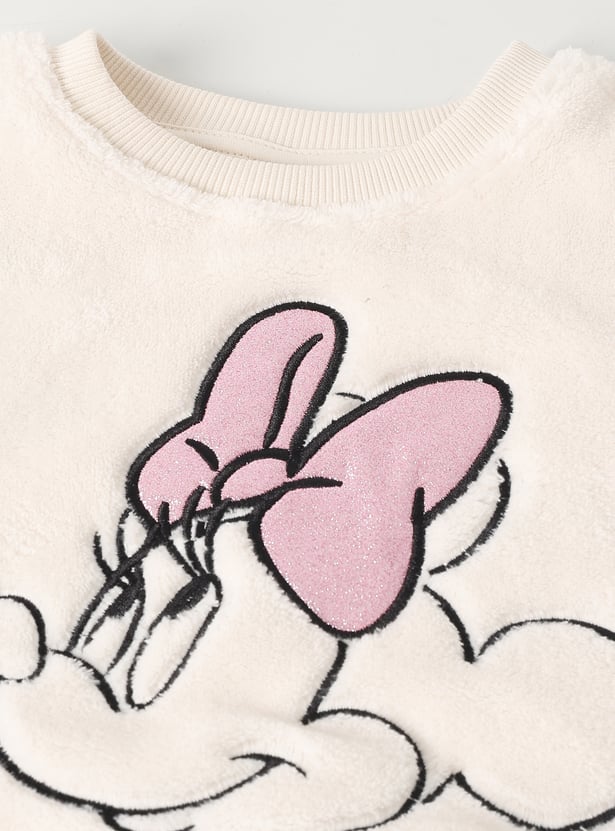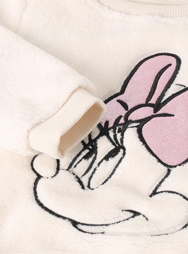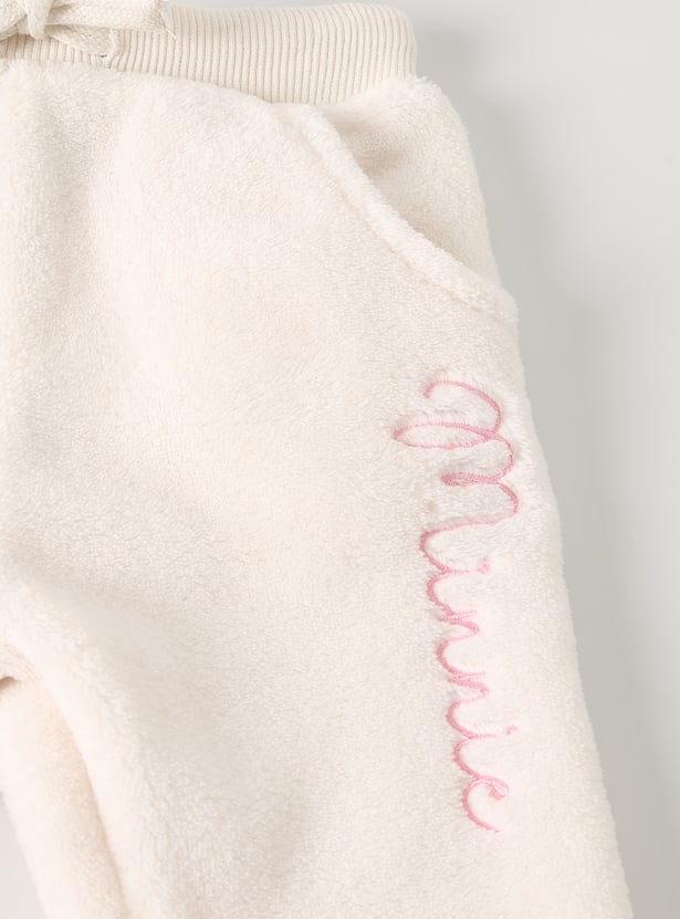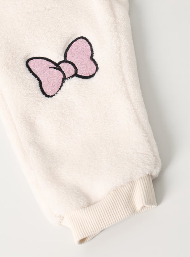This girls’ fuzzy jogger set features a Minnie Mouse embroidered top with shimmer details, a round neck, and full sleeves with ribbed hems. The matching joggers come with an elasticated waist and full-length fit for cozy comfort.