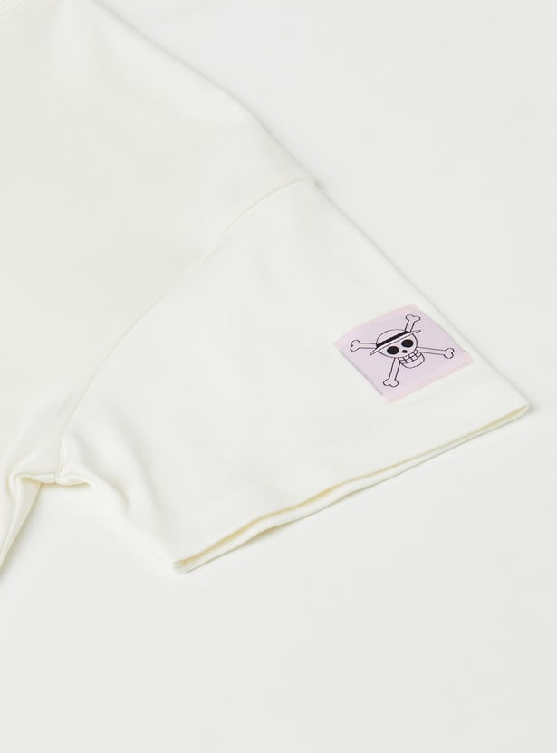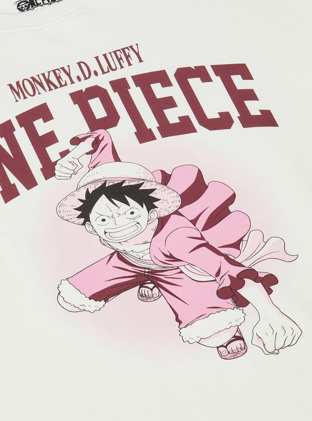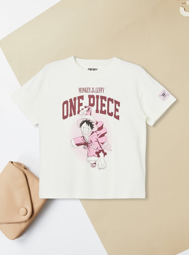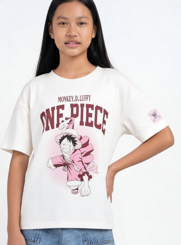 This One Piece print oversized T-shirt is a relaxed and stylish staple. Featuring a classic round neck and half sleeves, it offers a comfortable fit with a trendy oversized silhouette.